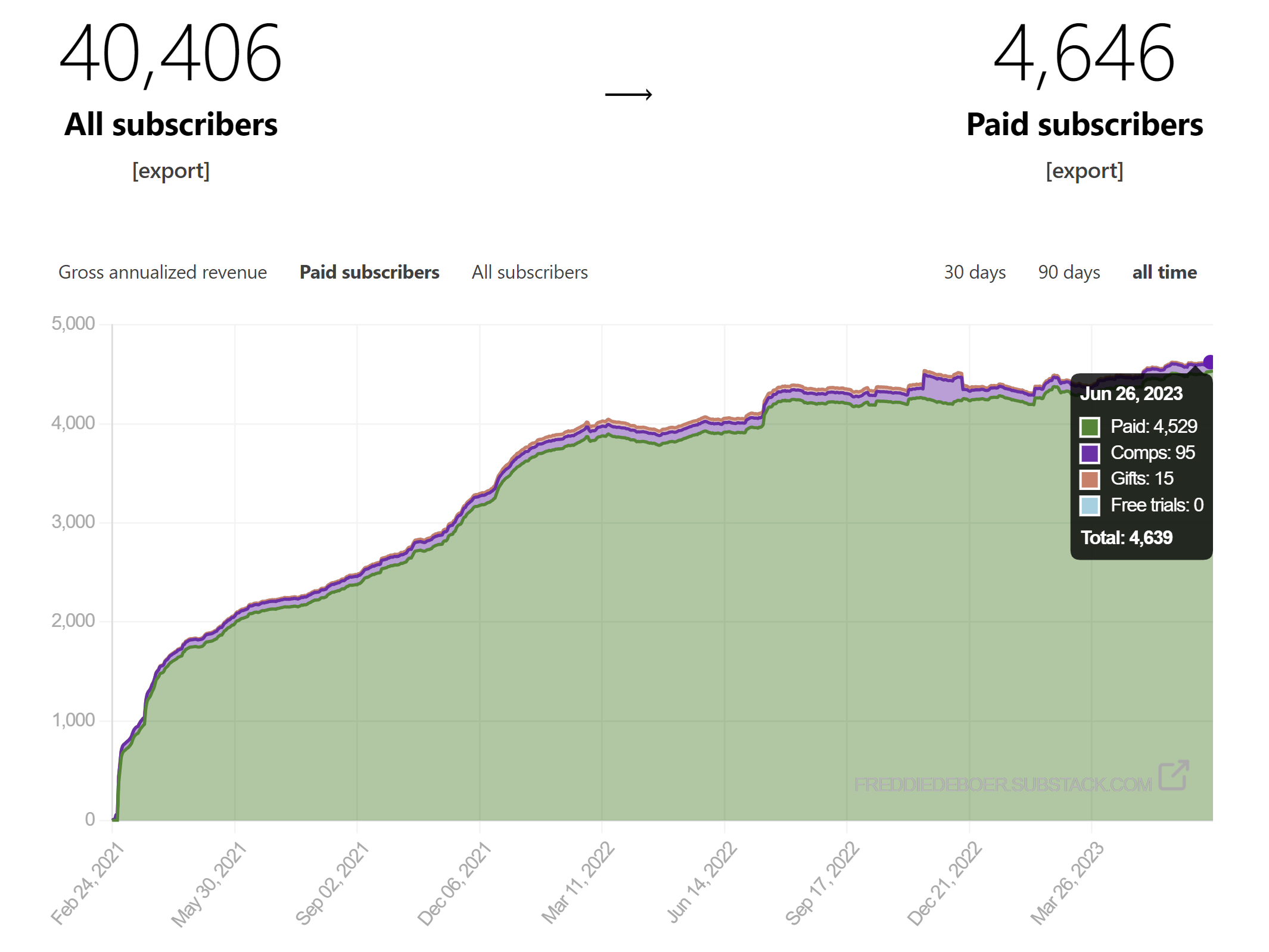 There was, as expected, a lot of grumbling when I came back on the scene. The grumbling didn’t (doesn’t) particularly bother me. It was frustrating that people said things that simply weren’t true, like “he never apologized,” “he doesn’t think he did anything wrong,” or “he was only gone like six months!” (That last one was hard to figure.) But that was to be expected, given the bad behavior I was plainly guilty of, and obviously, none of this was an injustice. I really didn’t know if anyone would subscribe, but they did, and pretty quickly. By two months in it was clear that this could indeed be my profession. As you can see, it’s been a matter of one big jump in the beginning and then a lot of maintenance and slow growth and sometimes stagnancy. Of course, it’s easy to mistake this for a lack of turnover, but presumably a lot of that stagnancy is people letting their subscriptions lapse while others get on board. (Presumably, because I have literally never looked at subscription cancellations or received emails to tell me when they happen, so I genuinely don’t know. I’m too delicate!) It’s been abundantly clear to me that, in the subscription biz, you have to keep your foot on the gas or you’ll head in the wrong direction. Also, it’s very strange to be paid in weekday deposits that are influenced by so many factors; it makes planning a little difficult. I once had six straight weekdays where my deposits were more than $4,000, while as of right now this coming July 3rd deposit is set to be literally $4.05. Well, anyway: I make a lot of money, and I’m very grateful for it.