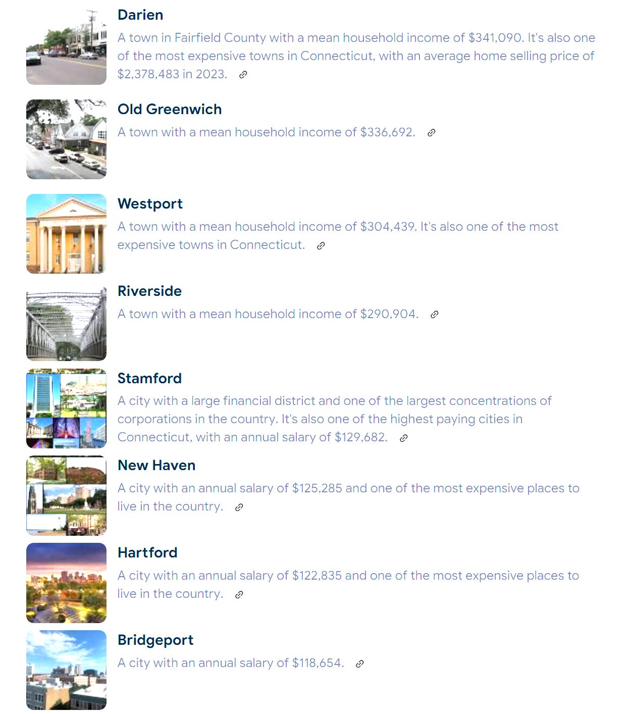 I asked Google’s Gemini AI for a list of the richest municipalities in Connecticut; this is what its generative AI returned. I’ll forgive you for not understanding the problems that are apparent to a local. First, Old Greenwich and Riverside are not distinct municipalities at all but rather villages within Greenwich. I suppose you can argue that they should be ranked separately, as they have their own ZIP codes, but I explicitly asked for municipalities and villages/neighborhoods don’t qualify. And, anyway, the bottom of the list rather borks the whole thing regardless. Bridgeport and Hartford are two of the most notoriously economically-depressed cities in the entire country, and if New Haven isn’t quite there, it’s a lot closer to those poor cities than to Darien. There is no way to make an ordered list of Connecticut’s towns by wealth or income and find Hartford or Bridgeport anywhere near the top. And, indeed, Hartford is the very poorest municipality in the state, with an actual median annual income more like $29,000; Gemini’s figure here is only off by about 550%. Whoops. In reality there are dozens of municipalities that are richer than Hartford or Bridgeport in Connecticut, a state defined by massive wealth inequality.