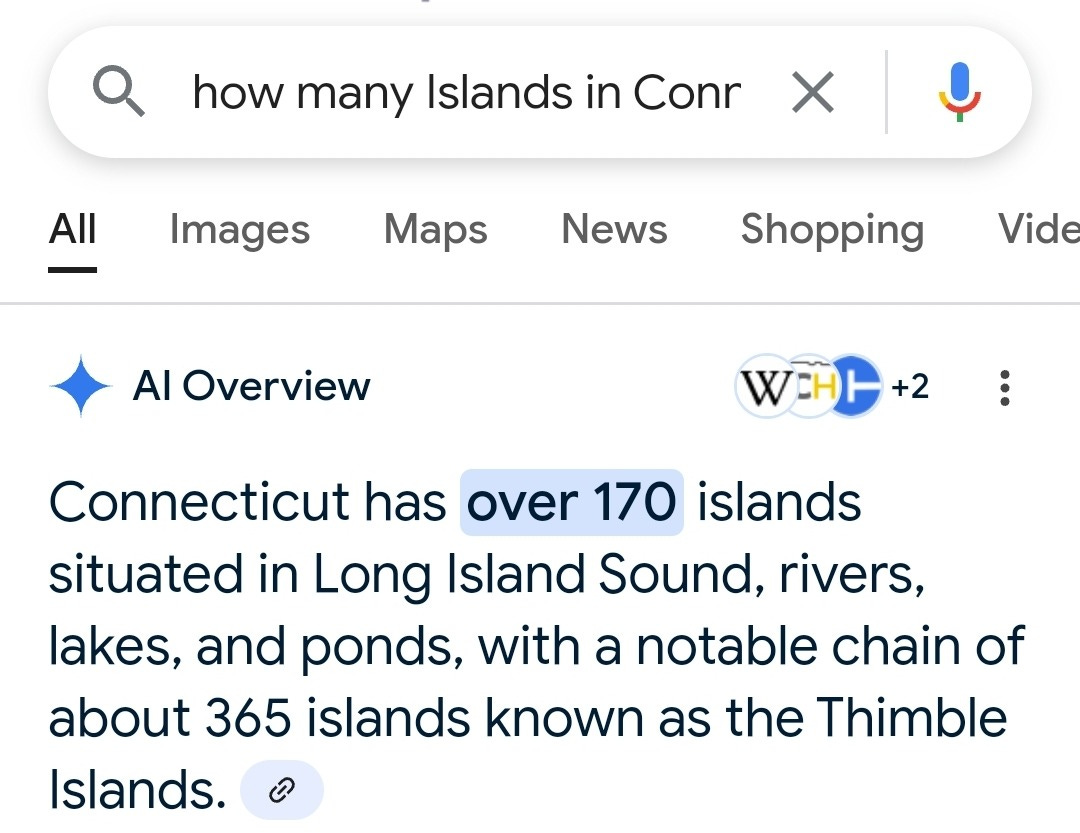 I suppose if I wanted to be particularly generous I could say that 365 is indeed over 170, but of course this is not how we use that kind of language. If there’s 365 islands just in the Thimbles then “over 170” is a flatly distorted answer to the question, and obviously so - so obvious that almost no human mind that was paying attention would miss it. And, anyway, everything about the construction here implies that the second number is a subset of the first. This is precisely the kind of natural language task that an AI has to be able to handle effectively to be useful, and this kind of failure has been common to Gemini and to all the rest. It’s also exactly the kind of problem that you’d expect from a stochastic parrot, an extremely intricate (and admittedly impressive) processing system that produces statistically-likely responses to prompts without any deeper understanding of the answer that it provides.