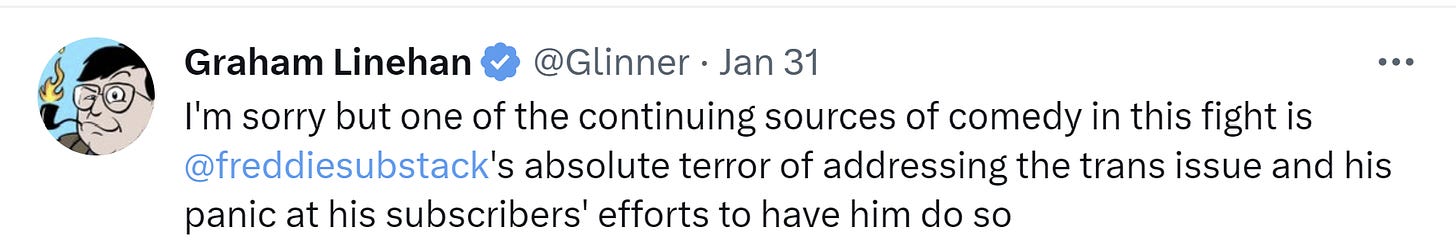 Recently, I was again moved to reiterate that I will not tolerate negative fixation on trans people in my comments. I have in fact felt compelled to declare comments on this issue off-limits in general unless I specifically bring the subject up. The problem stems from a small minority of commenters, and commenters are a small minority of readers. But discussion of trans people in the comments space too often creates an environment that’s unwelcoming and hostile, and I’m not willing to accept that. This isn’t a betrayal of my civil libertarian principles because the comments section of my newsletter is not an open forum or platform in which anyone can say anything. Were I the CEO of a social media company I wouldn’t enforce the standards that I’m enforcing here. But I’m not; I’m a writer producing a publication that hosts a comment section as a service to readers. I will implement my own policies for what can be said in that comment section, as I please.
