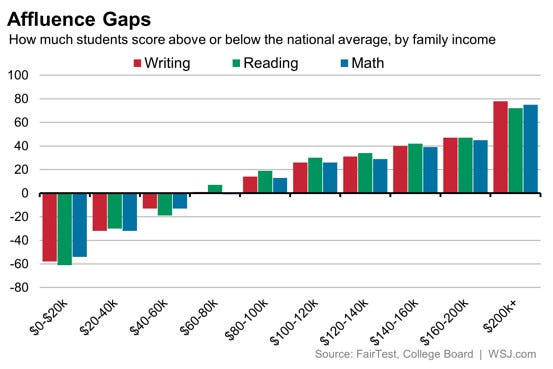 The above graph is no doubt pulled from a different dataset, and you do see slightly higher r² figures in some research. But all of the data of which I’m aware is more like Sackett than not - consistently, familial income just isn’t a very strong predictor of SAT scores, no matter what Twitter tells you. And, given that SAT scores are not easily modified with tutoring, it’s truly strange that the very-real phenomenon of rich students having a leg up in college admissions is blamed on the test. If you can get a “college counselor” (read: mercenary who you pay to get your kid into college) to talk to you frankly, they’ll tell you that the SAT is the hardest element for rich families to game. But because our discussions on race and class privilege are always tissue-thin, and because so many people harbor personal resentments for the SAT because of the stress of taking it themselves, it’s powerfully difficult to get the establishment media to reflect on any of this.