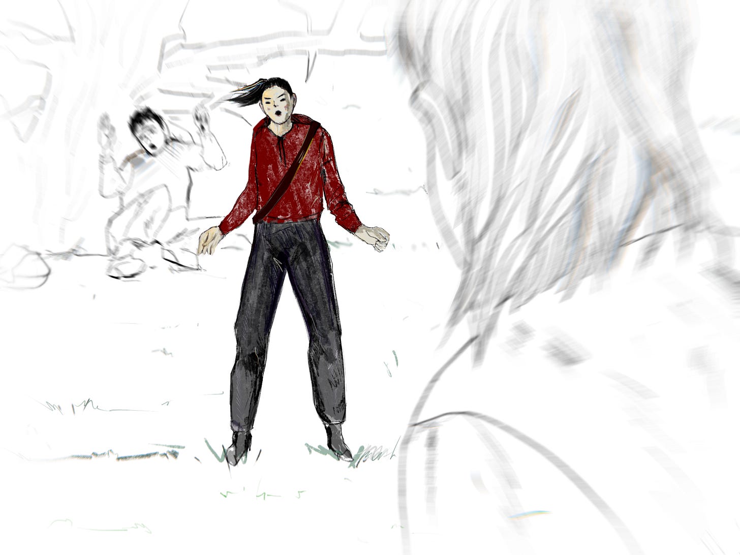 He limped up behind the helmeted bandit, who himself was dragging his leg. He seemed disoriented and aimless as he retreated. As she stumbled forward, Haojing could not help but note the comical sight of the two injured, exhausted men, engaged in a pathetic race. But when the man she had saved bent over and grabbed the lawnmower blade, she knew that nothing funny was about to happen. Shaking her head, she set off after them.