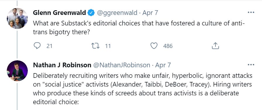 You hired me for years, Nathan. Nothing I was writing about then was different from what I write about now. Was that a “deliberate editorial choice”? Or did the political wind start blowing in a different direction and you panicked and changed course? I have deep contempt for this type of cowardice and opportunism, which is almost universal in media. You can hate my writing and my opinions, but I’ve written with the same politics for 13 years and I have never chased what’s professionally convenient. (To put it mildly.) Robinson meanwhile routinely published leftist contrarians like me when he thought it would be profitable and then got woke religion at exactly the right time. For the record I and others have challenged Robinson to provide evidence for his claim about me. He has refused to do so, but has not retracted what he’s said. I don’t talk about trans issues, have perfectly conventional progressive opinions on those issues, and no one has ever come up with a specific thing that I’ve ever written or said that is meant to be transphobic, but sure, throw my name in there. It’s a simple calculation, right? It’s now better professionally for Nathan to be perceived as being against me, despite trading on my name when he was trying to get his zine off the ground, so that trumps the fact that he has no basis whatsoever for his criticism.