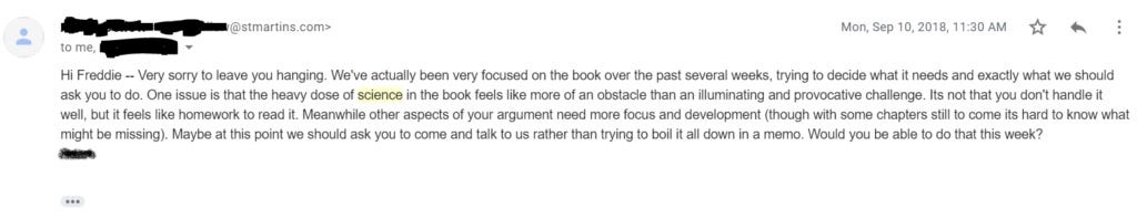 That was one of the most repeated criticisms of the book, not enough engagement with the science, and I could have avoided it if I had stood up to a publisher’s requested edit. Ugh. (I probably would have lost the argument no matter what.)
