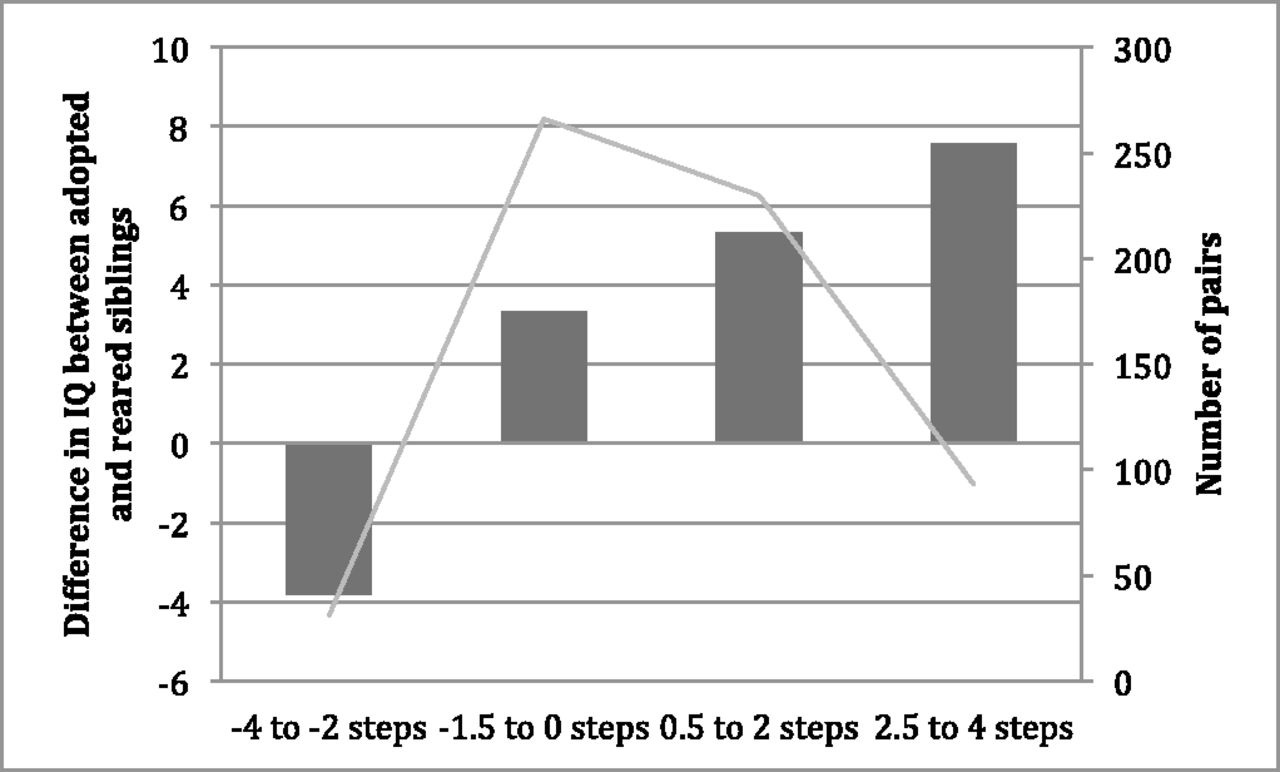 Turkheimer argues that this demonstrates a strong effect from being reared by parents with significantly greater education. But the chart can be a little misleading if you don’t apprehend the scale of the Y axis. The difference between 0 step-ups and the largest step-up is 7 points of IQ. (If IQ gives you the willies, remember that it correlates quite strongly with years of education and think of it in those terms.) 7 points is not nothing, and is consistent with what I’ve always said, which is that there is some environmental impacts on academic and cognitive outcomes. But consider what it means that the massive environmental difference of separate families can only muster an additional 7 points of IQ. And of course placing students into an entirely different familial environment is not a practical means of fixing things. Meanwhile the Wilson effect suggests that the importance of the family environment on cognitive outcomes fades over the course of childhood. Note too the possibility that both SES and educational outcomes are genetically influenced, in which case changes to family SES would not necessarily result in changes to educational outcomes.