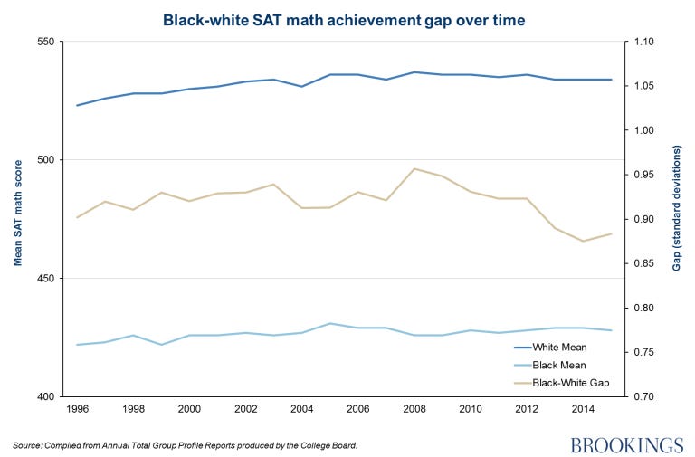 No. As I have argued repeatedly, including in my book, it is perfectly consistent (and in fact quite sensible) to believe that the observed academic differences between individuals are partly because of intrinsic differences (whether genetic or not) while the differences between certain groups (such as genders or races) are purely environmental. That is in fact what I believe - that within-group variation (differences between any individual kids, including within the same race) has an intrinsic component while the between-group variation between races is environmental. Racism is a powerful and multivariate force that could suppress the performance of Black students even while those students have varying individual academic potential like anyone else. To spare people who have heard this song and dance from me before, I will explain more in a footnote6. For an endorsement of this position from someone who (unlike me) has scholarly credentials in this area, you might consider Richard Nisbett’s Intelligence and How to Get It, although I do not share Nisbett’s optimism about the capacity to improve academic outcomes generally.