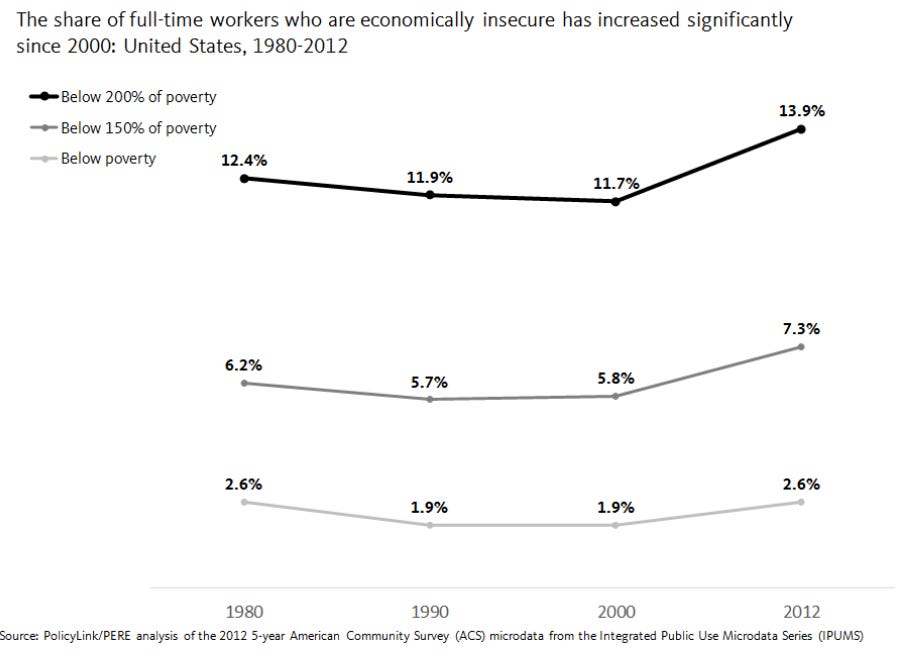 Education will never be the way we create economic security for all because, as I discuss at length in the book, it can’t be. There are all sorts of reasons for this that don’t even depend on belief in innate aptitude. Every president going back at least as far as Ronald Reagan has claimed that education is the key to solving our economic problems, but how this is going to happen is remarkably undertheorized. The general thrust of policy and rhetoric seems to be to send more and more people to college; after all, there is a wage and unemployment premium associated with a degree12. But I’ve already linked to the NBER paper that shows that the college wage premium is inversely proportional to the number of people with a degree in the market. (As common sense also suggests.) Which means that if we give everyone a degree then the market advantage of that degree will disappear. When you go on the labor market your degree is valuable because it shows how you are unequal from your competitors who don’t have one. If they all have one too (equality!) there’s no longer that inequality in your resumes and thus no positive inequality in your desirability as an employee. What will follow is an acceleration of the credentialism arms race, exacerbating the recent ludicrous increase in the number of masters degrees.