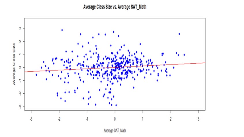 It’s also perfectly easy to find studies that find that class size advantages that are not remotely efficient give the expense associated or which find no meaningful small class size advantage at all. In 1995 Karen Akerhielm found performance boosts from reducing class sizes… by 10 students, a decrease with a financially massive cost at scale… of 5%… and only in history and science. In 2000 Stanford’s Caroline Hoxby found no statistically meaningful effect at all. Sathish Kumar does me a solid by providing a scatterplot in his 2019 study on student performance predictors: