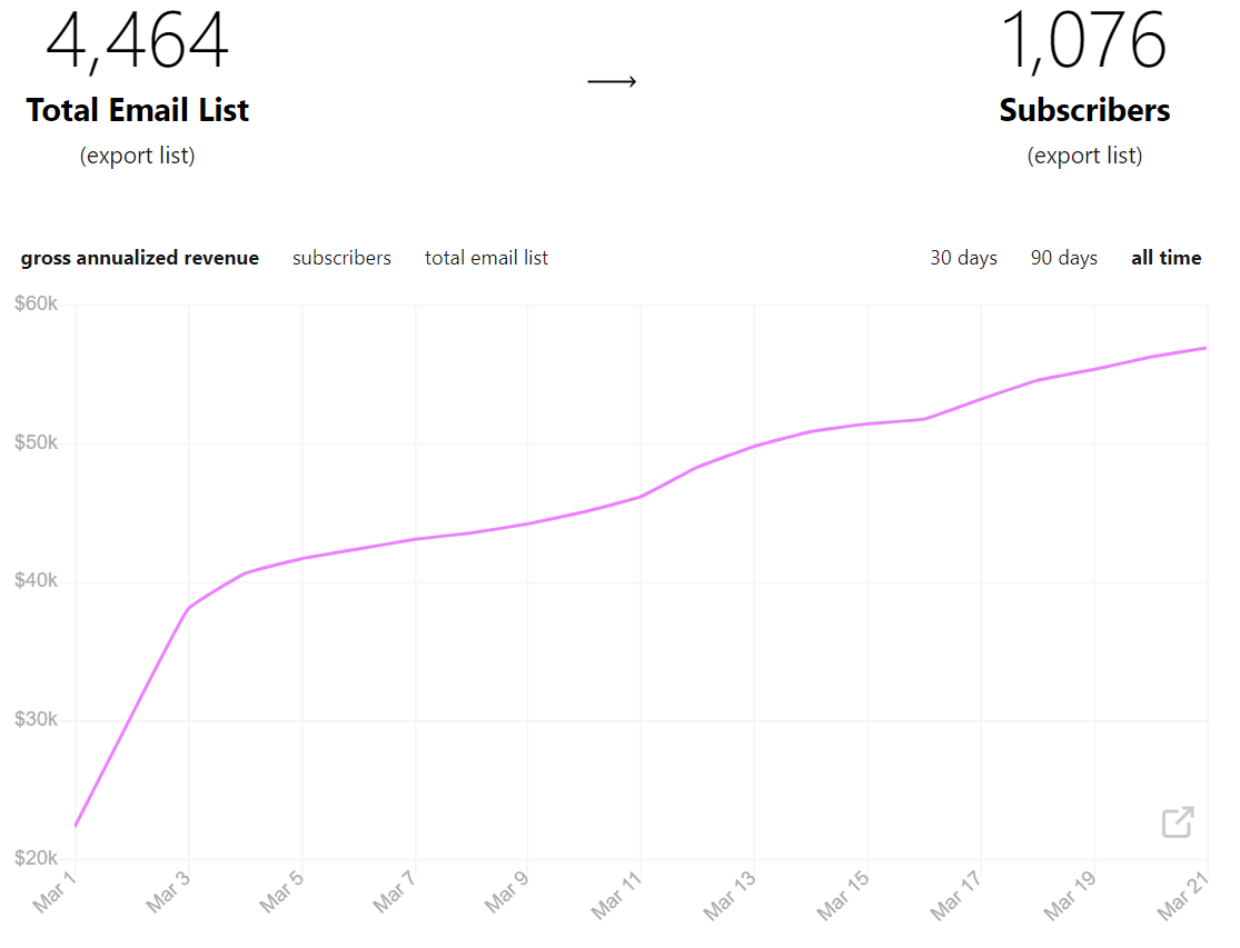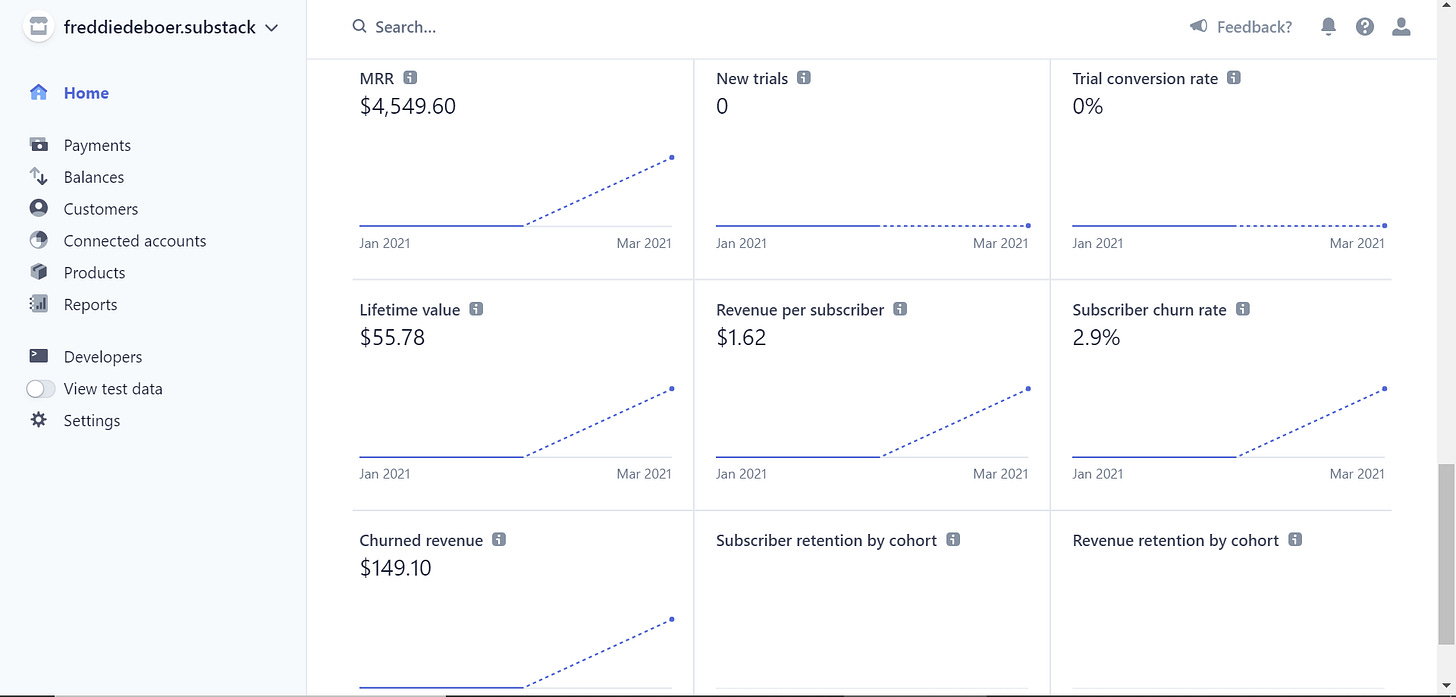 Someone emailed me and asked that I divulge financial information regarding my deal with Substack. She was quite aggressive, which I don’t like, but she framed it in terms of achieving the transparency necessary for gender equity. In that spirit I agreed to share the information, but publicly rather than sent to just her. It’s all below the fold. My first post was March 1st so it reflects 20 days so far. I didn’t ask whether she has requested this information from anyone else because I don’t care. It should go without saying that my doing this does not imply that anyone else has to do it too.