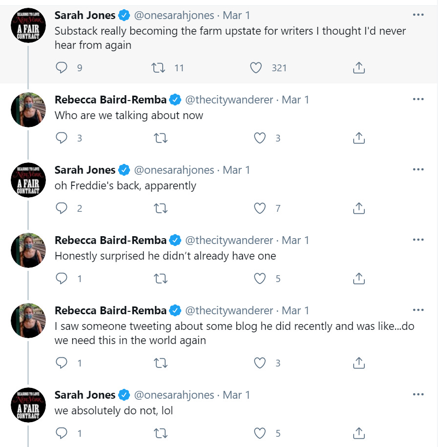 The reason why is because she is one of them. She’s in the club, so it’s OK. She’s in the digital media kaffee klatsch. (Apparently so is something called Rebecca Baird-Remba; I don’t know, I don’t read Commercial Observer.) She’s done the necessary ingratiating with that crowd. She’s liked the shitty joke tweets and pretended to care about the latest controversy and gritted her teeth and congratulated writers she really, really didn’t like about their new jobs. She has completed the rituals, the sorority rush period by which people in media are awarded a rung on the ladder. That’s why she’s allowed to do it, and I’m not. That’s the only reason. If the situation was reversed and Jones posted some old tweets of mine in a newsletter, nobody would bat an eye. The rules emerge purely from your place within the hierarchy. An intern at Buzzfeed can’t use the word “crazy” without being called ableist; Jia Tolentino can make herself out as the victim of a story about human slaves and emerge with more clout than she had before. The only rule is to be popular.