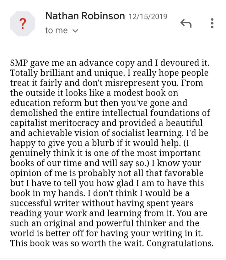 Here is an email Nathan Robinson once wrote about my book