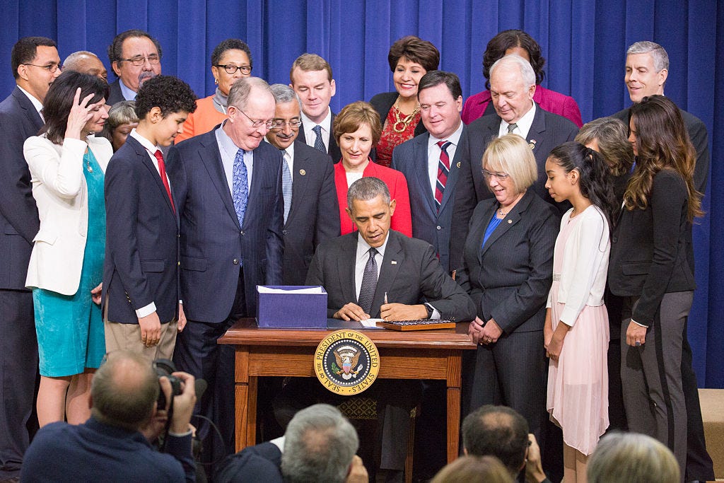 In the 1990s increasing concern about badly failing schools in Black and low-income neighborhoods sparked new federal spending that came with strings attached. Although federal dollars today amount to only ~10% of all public school funding, this money is disproportionately concentrated in our poorest districts, which in turn drive policy to a remarkable degree. Concerns that the United States is an educational basket case, while very debatable – the median American student does OK and our top 10% or 5% are among the very best in the world – drove the adoption of No Child Left Behind and Race to the Top. All of the conventional wisdom of the time, including the unproven but dogged belief that national educational outcomes could be substantially changed by policy, were represented in these laws. NCLB furthered the test mania that states were already instituting, again based on dubious evidence. (George W. Bush’s “Texas miracle” was considered a primary model, but inconveniently that miracle was the result of selection bias, as almost all powerful educational effects are eventually revealed to be.) And it crystalized the “teachers are the problem” school of thought into policy. Suddenly there was federal control of teacher behavior in a way there never was before. Still, the law took pains to delegate specific standards and enforcement mechanisms to the states, resulting in an even more bizarre system of overlapping jurisdictions and jury-rigged systems. NCLB was, notoriously, spiked after years of failure to meet its absurd standards and a slowly building resistance to the ever-expanding testing regime, though its replacement is not much better.