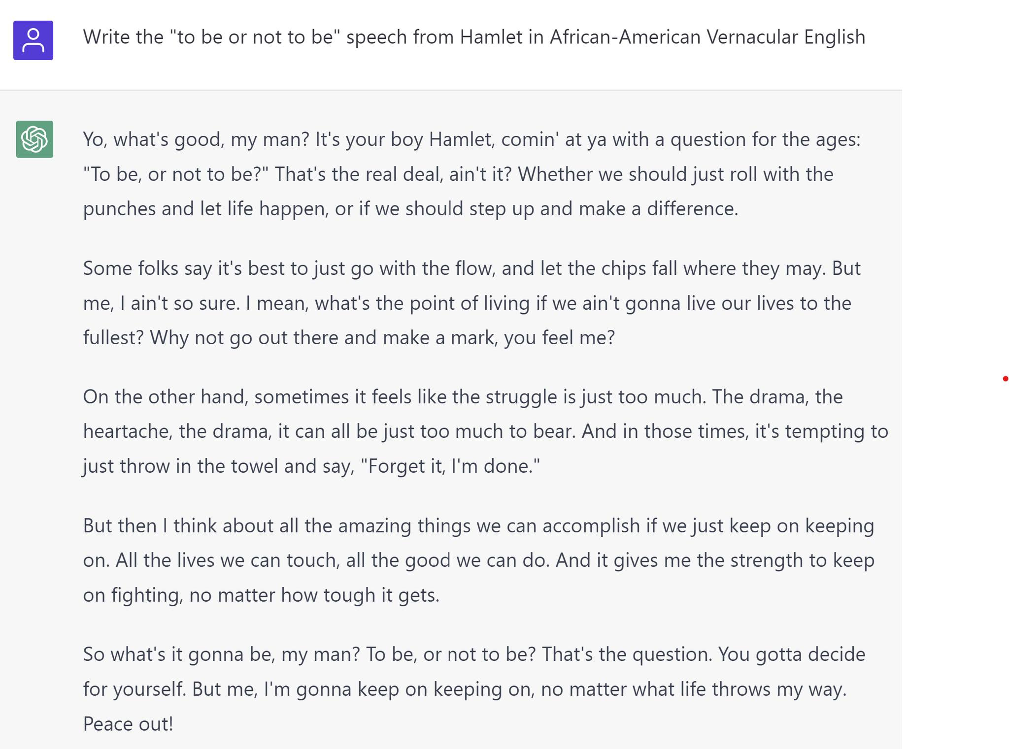 I will, I’m sure, write a more comprehensive piece on ChatGPT sometime soon, particularly regarding the possibility of such software eventually replacing all human writers. (I’ll briefly note that answering this question won’t depend on the technological sophistication of the model. Here in New York people make a living pulling rickshaws. Human beings value many things more than they value efficiency, at least in the right contexts, and one thing they value is a human touch even in arenas with demonstrable technological superiority.) But for now, let’s take a look at the above. I, uh, have serious concerns!