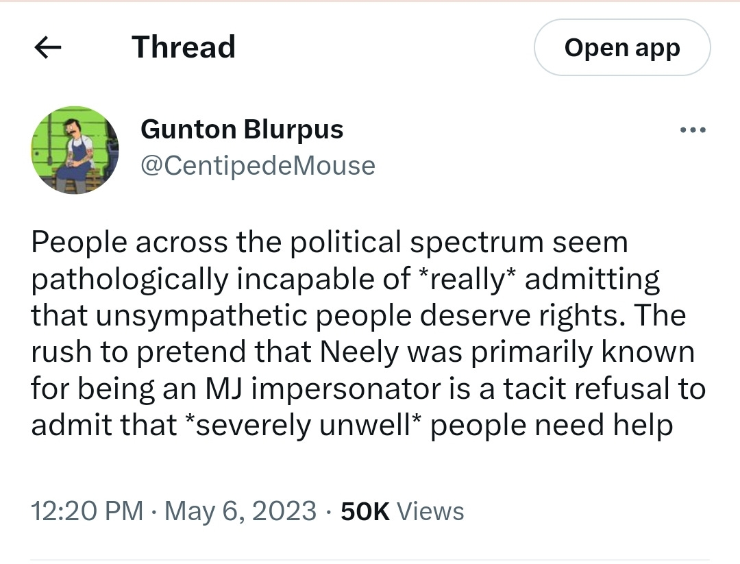 If your response to a crime committed against someone is to minimize their negative qualities, you are inherently accepting the logic that the crime committed against them would have been justified had they not been as blameless as you’ve made them out to be. If you need Michael Brown to have been just an innocent 18-year-old who never did anything wrong in order to demand justice for his death, you don’t actually want justice. If your outrage about the killing of Jordan Neely requires you to say that he was just a blameless Michael Jackson impersonator who never did anything wrong, you aren’t actually outraged on his behalf. In each case, you’re only defending a caricature; your moral standards are provisional, transactional. You’re accepting the logic of “he was no angel.” Jesus insisted that we love everyone, including those who are down and out, including those who we don’t want to love. He didn’t say “love them because they’re really not all that bad.” He said that you are bound to love them whether they’re good or bad, whether you want to love them or not. Of course, I’m not Jesus, and neither are you. I’m not really telling you to love people despite their flaws. I’m only asking you not to kill them.