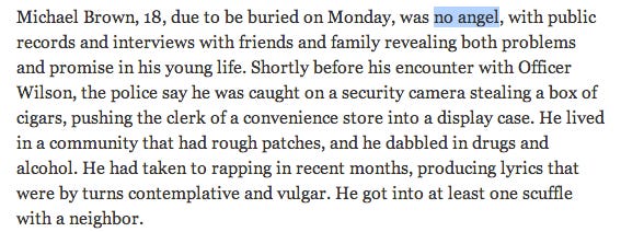 When Michael Brown was killed, and The New York Times ran the infamous passage above, the controversy that ensued struck me as uniquely sad, thanks to the way the reaction against it spoke the same language. There was justifiable anger that the Times would front an 18-year-old’s checkered past - whether real or propaganda is not the point - in a story about him getting shot to death in the street. Some of those who responded to the NYT piece, I’m sorry to say, responded by demanding that he was in fact innocent of the claims about his past and the allegations about his conduct on the day he was killed. I can understand this impulse, but I found it unfortunate in a really profound way. Because to respond to the implication of “no angel,” that someone might have been complicit in their own execution because of bad things they’d done, by denying that they’d done anything bad is to surrender to the assumption that such an execution can be deserved by dint of bad deeds. It attempts to win a battle by declaring surrender in the war.