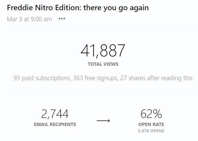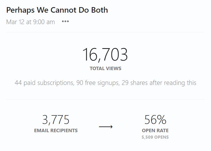 My own deal here is not mysterious. It’s just based on a fact that the blue checks on Twitter have never wanted to accept. I got offered money to write here for the same reason I got offered to write for The New York Times and Harper’s and The Washington Post and The LA Times, the same reason I’ve gotten a half-dozen invitations to pitch since I started here a few weeks ago, the same reason a literary agent sought me out and asked me to write a book, the same reason I sold that book for a decent advance: because I pull traffic. Though I am a social outcast from professional opinion writing, I have a better freelance publishing history than many, many of my critics who are paid-up, obedient members of the media social scene. Why? Because the editors who hired me thought I was a great guy? No. Because I pull traffic. I always have. That’s why you’re reading this on Substack right now.