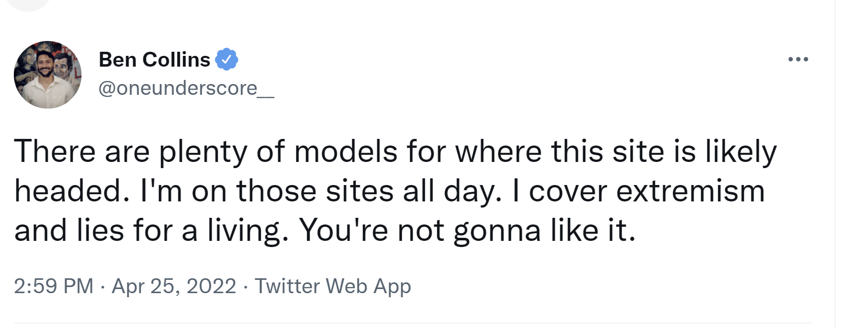So here’s the question, Ben: if you acknowledge that far-right sentiment flourishes on the internet in many places, what does keeping it off of Twitter accomplish? If the ideas and arguments and symbolism of fascism and white supremacy can be traded on the internet elsewhere, what are you preventing from getting more and more censorious on major social networks? Do you think people are going to go to Twitter to treat it like Stormfront, find themselves censored, and just give up? People like Collins believe that far-right sentiment is very prevalent and dangerous, that’s his job description. So in what world does a Twitter ban function as any sort of check on that? What’s the idea here?