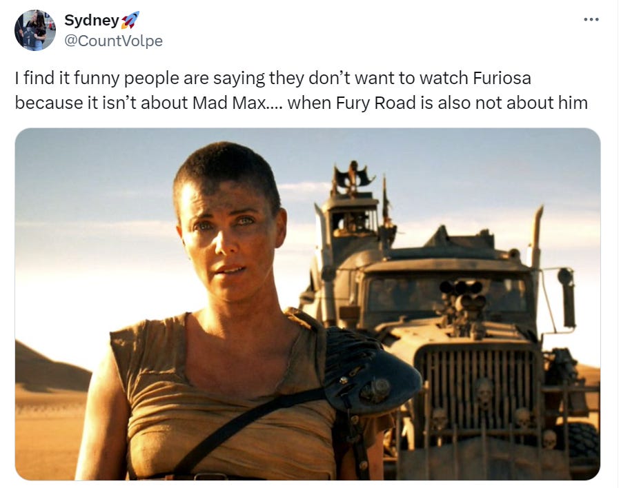 “Furiosa replaces Max in Fury Road” is so deeply stupid not because it simply ignores the facts but because it does so in pursuit of flagrantly missing the (brilliant and essential) political message of an unusually thoughtful movie. So why is it so popular?