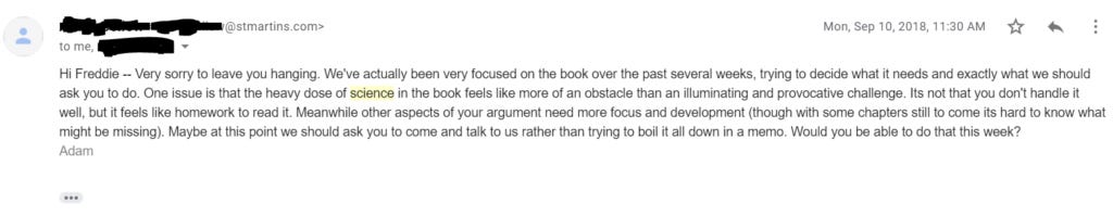 As you can see from the above image, the first major note, and one that would prove to be the biggest sticking point, was that the section on gene science was far too long in the eyes of the publisher. They felt the general audience reader would not tolerate reading as much as I put in. I pushed back at first, but ultimately some four pages were cut from that section. And so of course the first impression of many people is "he didn't engage enough with the science." I wish I had fought harder but when you're the first time author and they're the publisher, it's hard to be brave in that way. I deeply regret it. Of course I am, in the end, responsible for the contents of the book. I haven't easily been able to find the missing pages in an earlier draft in my files yet, but if I ever do find them I may publish them here.