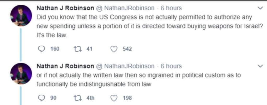 So it's a certainty that anyone who sees the Guardian's pathetic firing of Nathan Robinson as an example of Israel's privileged position within our political discourse will be cast as anti-Semitic. This is inconvenient because Robinson's firing is an example of Israel's privileged position within our political discourse. Here are the offending tweets: