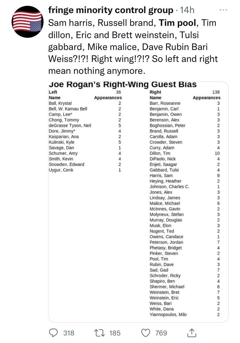 This kind of taxonomy is always going to reflect ideological biases, and specific names are debatable. I do think this particular tweet reaction is pretty funny: the Weinsteins, Dave Rubin, and Tim Pool I would call irrefutably right-wing at this point, while Weiss and Tim Dillon are not categorically conservative but are relentlessly anti-left in their work. Mike Malice, Sam Harris, don’t really care, I just think they’re mostly wrong about everything. Russell Brand is probably uncategorizable, although his recent endorsement of Donald Trump will certainly brand him. Either way, the point remains that Rogan has a lot of guests on who are ideologically neutral at least as far as the show goes (the ancient aliens types) and a lot of guests who hold conservative social positions and few who hold liberal social positions. The result is a socially conservative show, even though it’s hosted by a gay-friendly weed-smoking agnostic.