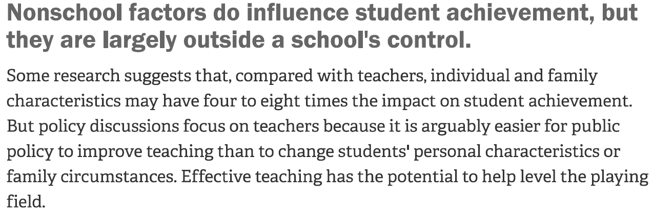 Indeed, I am on record as saying that I don’t think there’s really such a thing as school quality, and that while teacher quality may be a real and meaningful variable it is likely confounded to hell and there may be interaction effects2. That’s not the focus of this post and I won’t belabor the point here, but it’s worth mentioning. (My big picture summary of education research here remains maybe the most important thing I’ve published here, so check it out if you haven’t.) Before Jon Chait materializes like a poltergeist to complain, here’s the Rand Corporation’s education arm - very much a neoliberal pro-reform chop shop - summarizing how the variance breaks down: