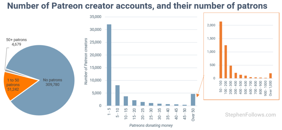 So why isn’t this all an endorsement of Griffin’s point? Why isn’t it clear that self-publishing is the way to go? Because there’s no denominator in Griffin’s essay, none. That is to say, she is suggesting a comparison (traditional publishing houses vs self-publishing) when she has no numbers with which to make the comparison. There’s no big self-publishing merger that produced lots of public data to crunch. Against the hard numbers that make publishing look bad, she can only pitch broad waves to conditions in self-publishing. That’s because we simply don’t have the necessary information. But it is a certainty that self-publishing follows a Pareto distribution as well. There is no doubt that the vast majority of people trying to make it in self-publishing are failing. There is no doubt that the vast majority working on newsletters will not have the success Griffin has had. Success in creative fields is hard to come by no matter what the model. That’s always been true of the arts! There’s no halcyon days when most artists made a living, and every reason to believe that creators of all types face markets defined by immense inequality. This Pareto distribution seen in Patreon patrons, put together by Stephen Follows, is a stark statement, especially given that the Pareto effect is fractal: