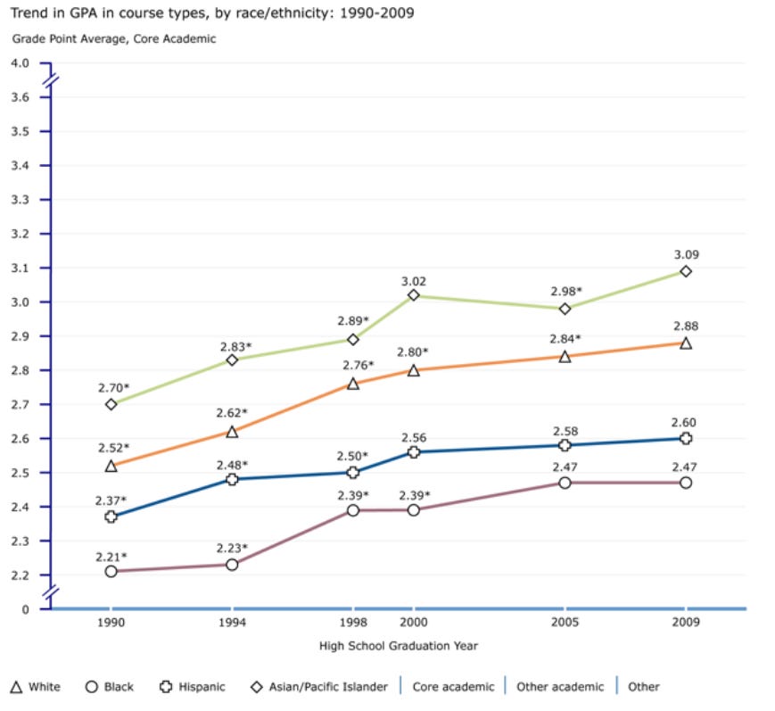 The SAT is officially gone from the University of California because they’re desperate to reduce the Asian student population they want greater racial diversity. Many prominent liberals have celebrated this news, largely because they already went to college and don’t mind pulling up that ladder behind them. (Also a lot of them didn’t get the scores they wanted and never got over it.) Unfortunately for them, essentially all educational metrics show the racial and income stratification that the SAT shows. That includes GPA, which the people who complain about the SAT constantly nominate as an alternative to… the racial and income stratification of the SAT!