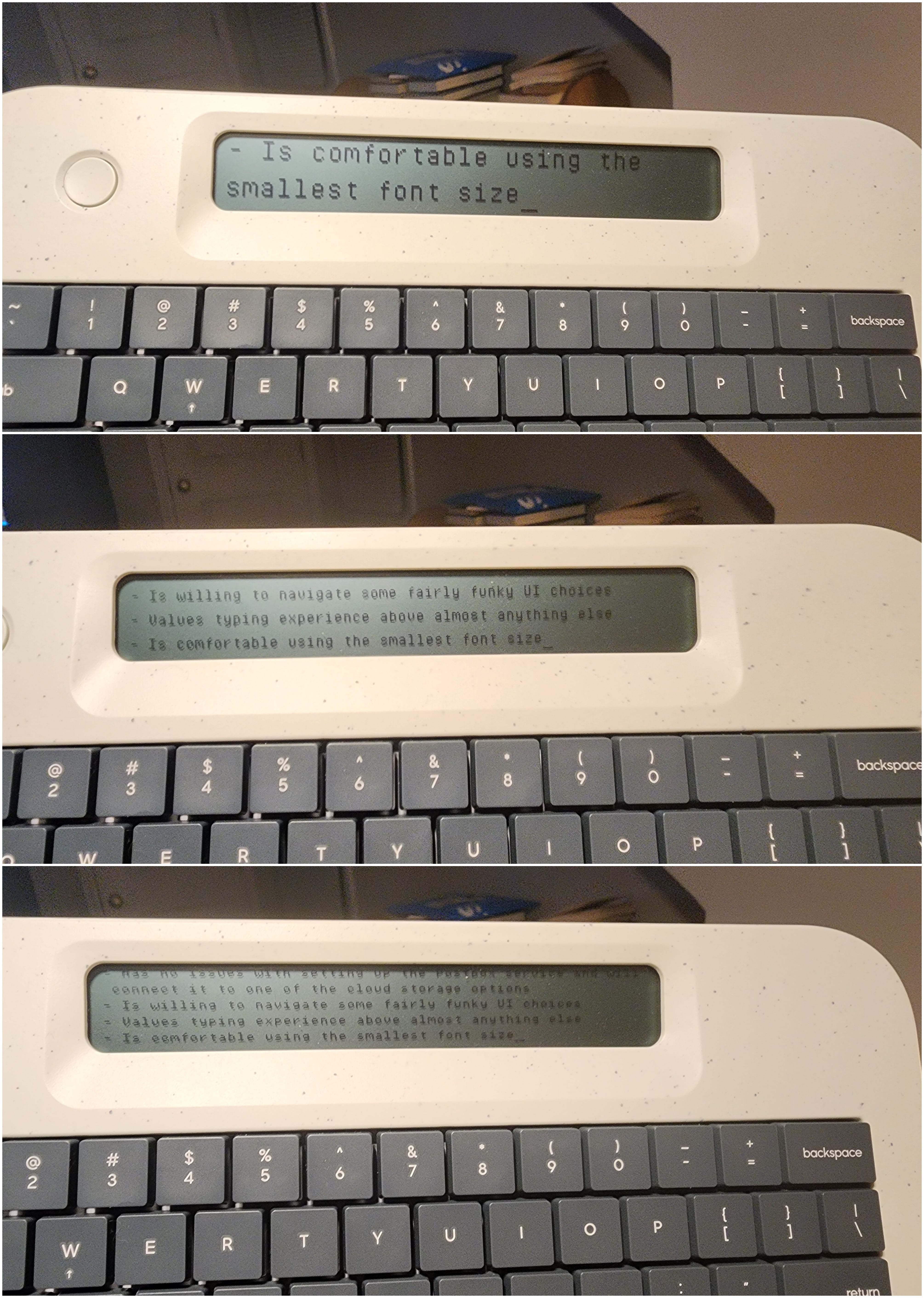 The screen itself is… fine. The original Freewrite typewriter had an e-ink screen, which was considered kind of chic, but they go with an LCD here, and honestly it’s the right choice. The advantage of an e-ink screen (a persistent image that requires no power to keep displayed) fits perfectly with a device designed for reading, as what’s on the screen is there for a long while and rarely refreshed; it can also be useful to have the last page displayed if the screen dies. There is no similar advantages for a typing device. A device for writing is necessarily constantly updating its screen, and has no use once the power dies, so e-ink’s natural benefits are simply not useful. E-ink devices are known for long battery life, but again this is largely a function of the screen rarely updating itself, which is antithetical to what a typing device is for. E-ink displays can still be expensive and can be unusually fragile, although both of these concerns have gotten somewhat less salient in the past decade. In any event, I think Astrohaus made the right call with using the simple, dim LCD that it chose. It’s true that merely displaying the text uses battery, but as noted this thing is such a beast when it comes to longevity that this was clearly not a major design problem.