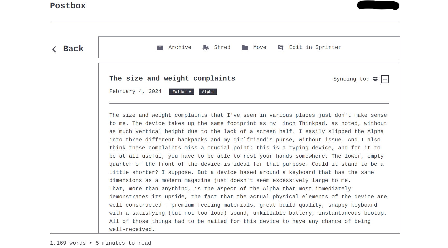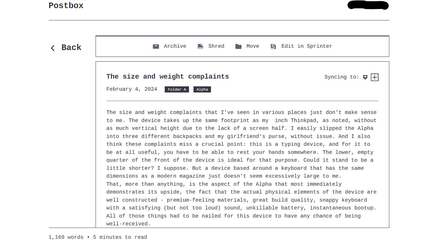 By the way, you’ll need the Postbox system not just to send your work to others but likely to export and edit it as well. I said I wrote this review on the Alpha, and I have, and had a good time of it too. But I also did a lot of editing in the Substack CMS, and would expect to do that in Word for other files too. And in fact I ended up using three different drafts/documents and combined them to get here, simply because I wanted to write into a blank space. This was perfectly fine for me, and it will be fine for the kinds of future projects that I will write with the Alpha, but it does reinforce the weird niche nature of this product line - it’s a word processor that will output writing that you will almost certainly collate and edit in another word processor. Everybody who will buy one of these things already has a laptop, but that sort of says something in and of itself.