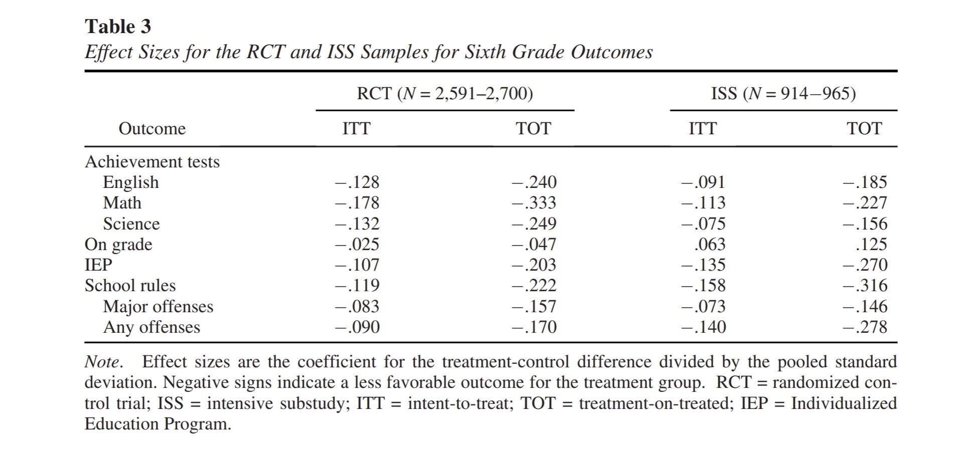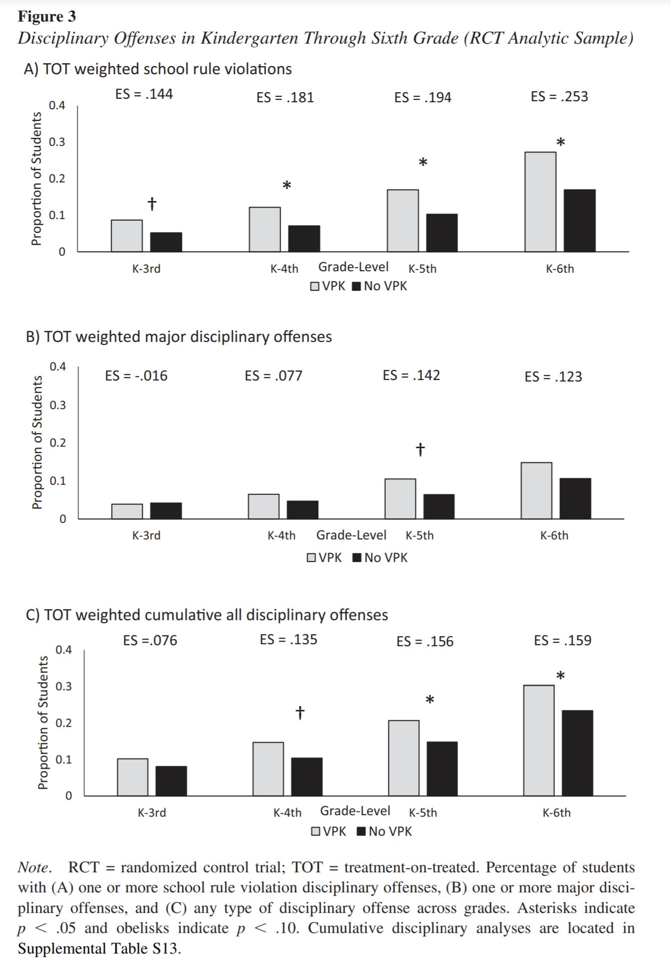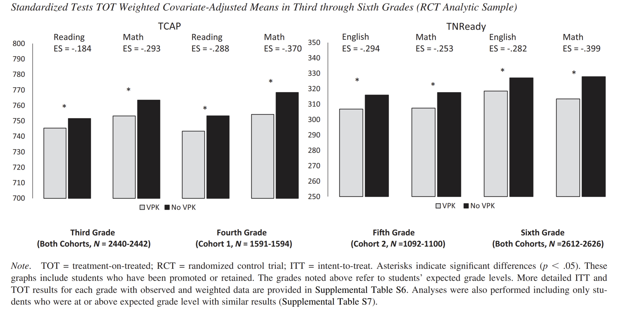 Attendance rates in sixth grade (proportion of instructional days without a recorded absence) were high for both TN-VPK participants and nonparticipants. Nonetheless, the difference between groups was statistically significant with a slightly higher rate for nonparticipants (97.5% vs. 97.1%, p = .013 for the ITT analysis with observed values). Supplemental Table S11 provides model details for each year (see also Supplemental Figure S3). Sixth grade was the first academic year with a significant attendance difference between conditions, although there were marginally significant effects in kindergarten and first grade.