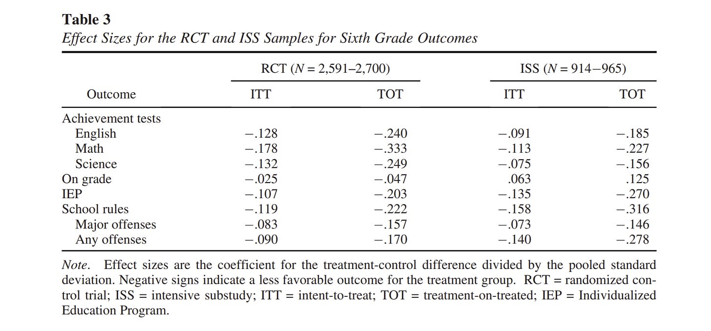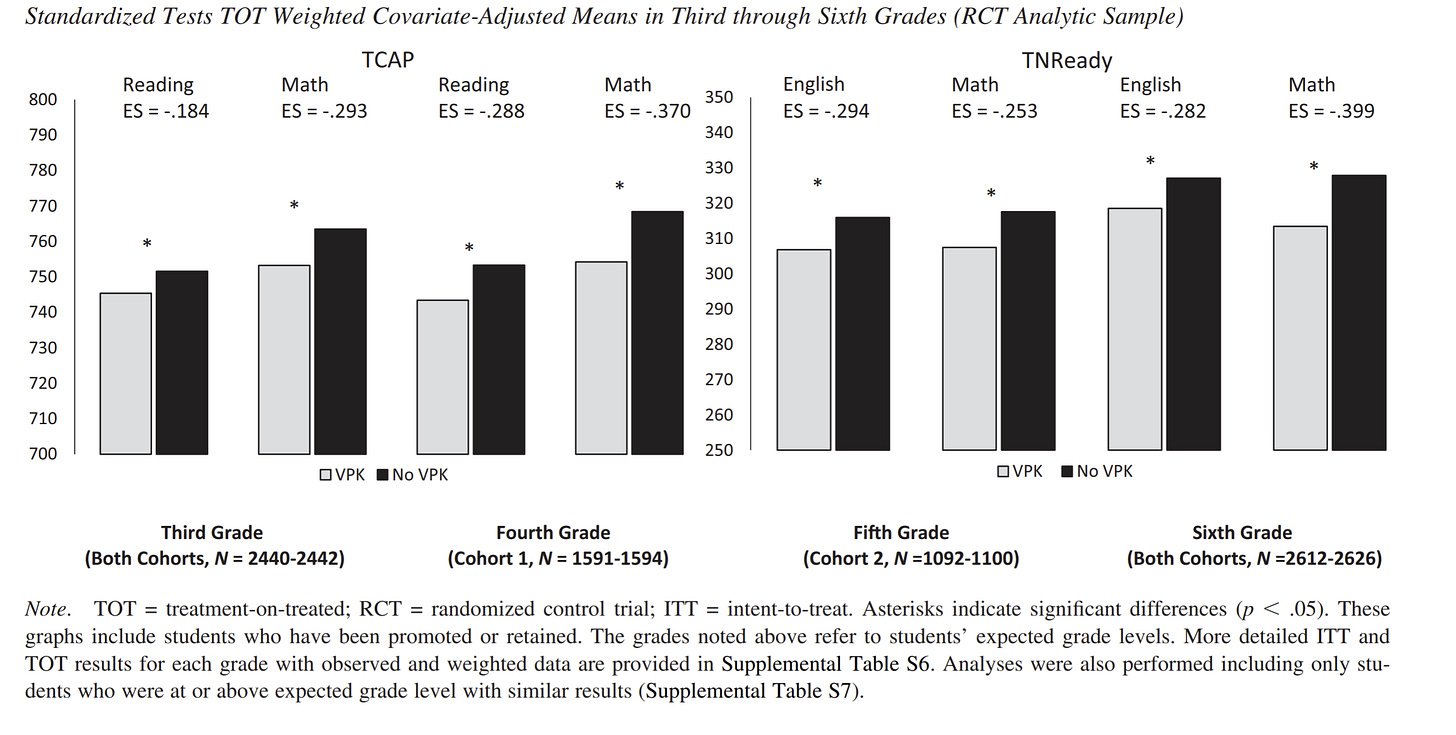 So, yeah. Looks bad! Random assignment to condition for a large and representative n studied longitudinally shows kids who got pre-K do meaningfully worse than those who didn’t.