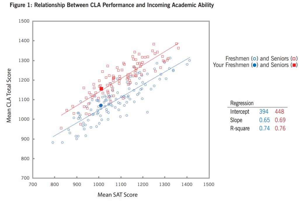 Yglesias also said, in the context of praising that consensus’s overall impact, “The campaign to close achievement gaps failed not because low-income kids and racial minorities didn’t do better, but because everyone was doing better, so gaps persisted.” Which I agree with; indeed, it’s simply a statement of some of the same issues with distributional coherence that I mentioned above, a reformulation of point 2 at the top. I’ve shared this scatterplot a jillion times, not because the data itself is particularly meaningful but because the dynamic is so prevalent in education - the gaps between the blue freshman test averages and the red senior test averages shows that students are learning in absolute terms, but because the schools on the righthand side of the plot improved as much as those on the lefthand side, the less-selective schools could never catch up. This is generalizable, as Yglesias’s observation about the racial achievement gap shows. I just think that this dynamic is more powerful than he seems to understand, and I think you can talk tough about accountability all you want, but it won’t matter if the people you’re getting tough with fundamentally don’t control the relevant variables. But a gradual shift towards understanding that schools cannot close gaps that schools did not create, however partial, is a good development and something I’d like to see more of from our commentators.