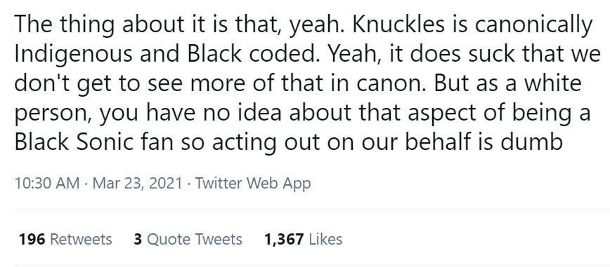 “Knuckles” here refers to a character from the Sonic the Hedgehog franchise of video games. As I understand this controversy, a fan artist depicted Sonic characters as humans, a common practice, and portrayed Knuckles as white. Another artist, themselves white, “corrected” this by altering the original fanart so that human Knuckles appeared Black. This prompted a days-long Twitter meltdown in this community about the racial identity of a cartoon monotreme from a digital world in which our protagonists gather golden rings to assist in their quest against a villainous scientist named Dr. Eggman.