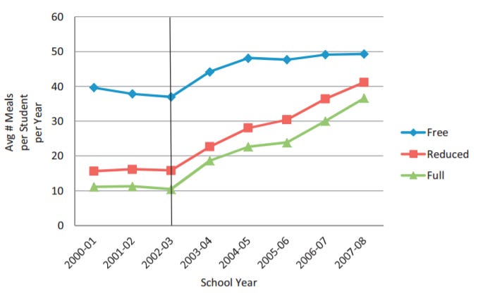 What did the authors find? The results of the policy change were modest, in almost every measurable way, and consistent across a number of models that the authors go into in great detail in the paper. Students did take advantage of school breakfast more after breakfast became universally free. On the one hand, students who paid full price increased breakfast participation by 55%, which is a large number; but on the other hand, their initial baseline participation rates were so low (again because breakfast participation is class-influenced) that they only ate on average 6 additional breakfasts a year. Reduced price and free were increased by 33% and 15%, respectively - the latter particularly interesting given that those students did not pay for breakfast to begin with. Still, that too only represents about 6 meals over the course of a year, not nothing but perhaps less than we'd hope for a program with low participation rates. The only meaningful difference in models seems to be when they restrict their analysis to the small number (91) of schools where less than a third of students are eligible for lunch subsidies, in which case breakfast participation grew by a substantially larger amount. The purchase of lunches, for what it's worth, remained static despite the price increase.