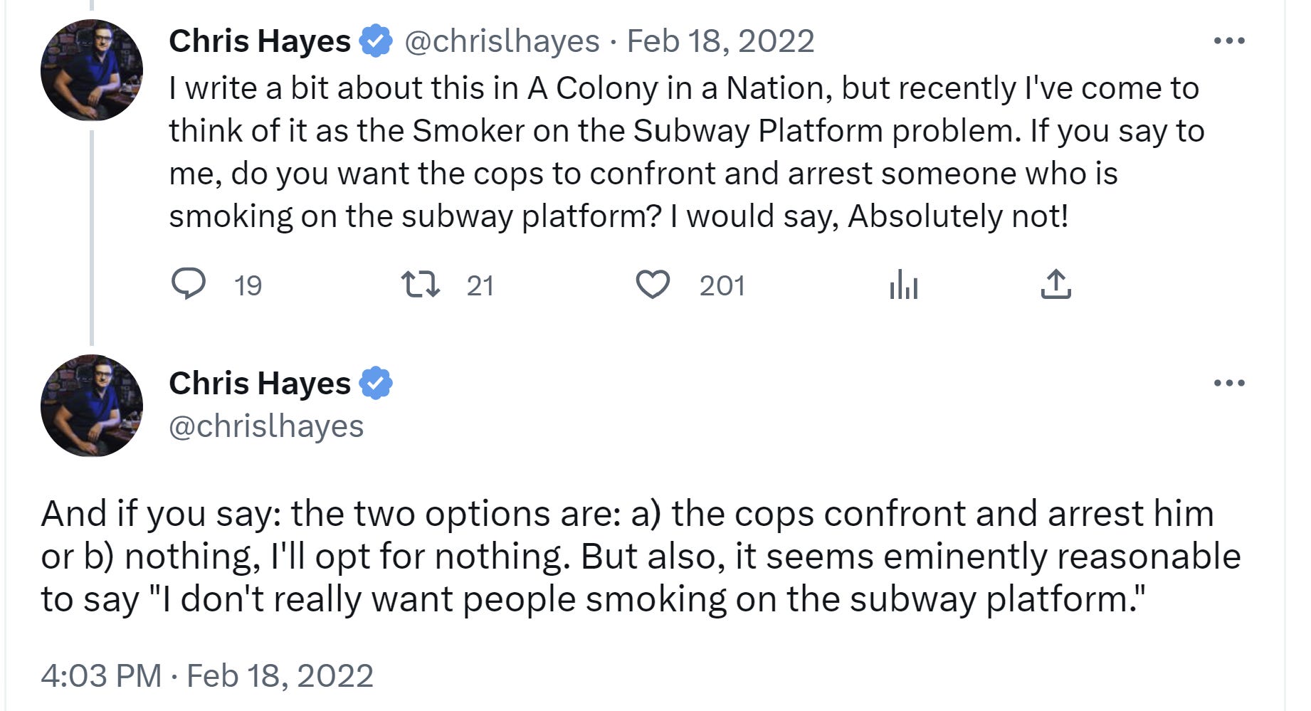 Conceptually, I don’t think these problems are hard at all: the left, the socialist left, has never advocated for a system in which there are literally no expectations on personal behavior. It’s quite bizarre to suggest that this was ever a thing! Only certain extreme forms of anarchism have ever implied that society should have no rules. Go back through the history of socialist theorists and number all of the ones who believed that there should be no laws and no police to enforce them. You won’t find many! Instead you’ll find people who believed in the need for both laws that govern human behavior and constabulary forces to enforce those laws. That’s the solution to the conundrum, my friends - you have rules and you have police that enforce those rules. The belief, and the hope, is that a socialist society is one with far less need for aggressive policing, thanks to far greater economic equality, and maybe someday, after the end of material need, we can consider a policeless society. But not having any social rules or people who enforce those rules is not a socialist concept and never has been. What I would ask Chris Hayes and people like him is… what is the leftist tradition that you’re drawing from that implies that there should be no enforcement of behavioral norms? What thinker? What book? What philosophy? Or, could it be that you’ve developed this totally substance-free approach to basic order because you’ve been habituated to talking this way through exposure to people on social media who know nothing about anything in particular?