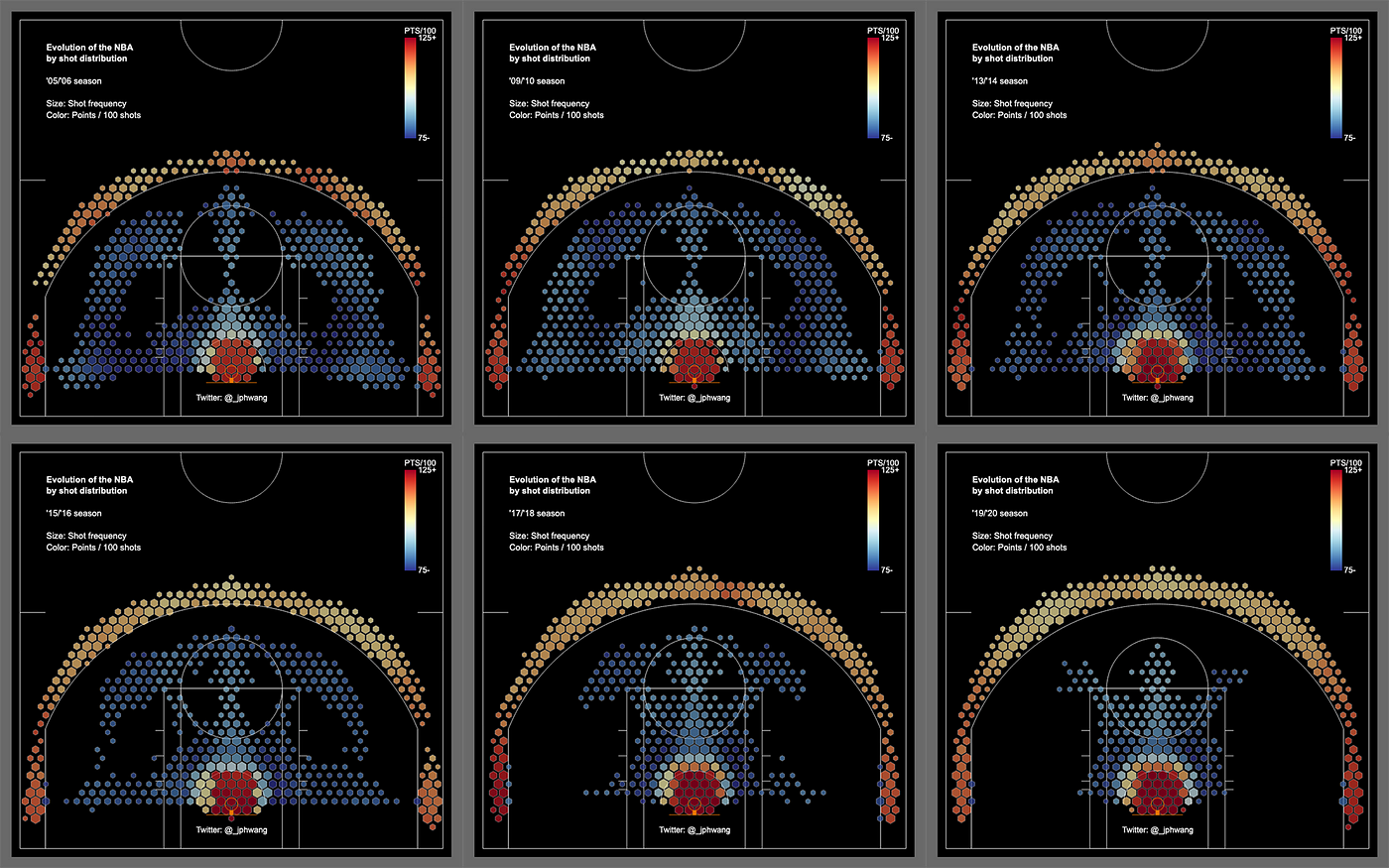 Basketball too has attracted criticism for years over its cramped and constrained modern tactics, which have produced a game where teams relentlessly pursue three pointers and layups to the detriment of other kinds of shots. This arguably results in a game that’s less fun to watch; it certainly results in a league full of teams all playing the same overall style of ball, at least at the macro level. You can see that clearly in this visualization of average NBA shot charts, which covers just 15 seasons of play, from 2005 to 2020. An entire world of two-point shots was lost as NBA shot selection was hollowed out in pursuit of maximum offensive efficiency. The fact that there are essentially no NBA teams that have consistently bucked this trend suggests that this strategy really does represent the best way to win. But some fans find the resulting play to be less engaging, which degrades the entertainment value that makes the NBA financially viable.