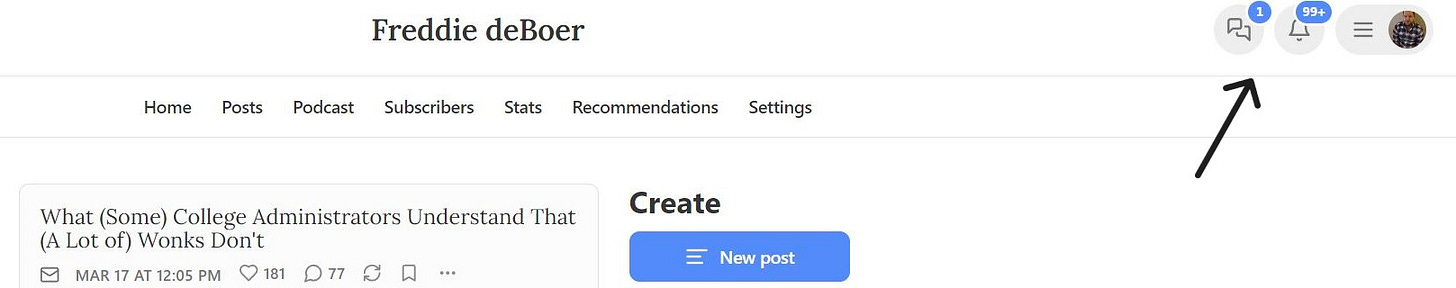 Instead, we got all of this social network stuff forced on us. This includes the recently-unveiled direct messaging system, which is just baffling to me. This is an email newsletter! The communication with my readers goes through email! They can reply to one of my emails, or they can just send a message to my email address, which is listed on the front page of this newsletter’s website. Why on earth would I want another way for people to reach me? For what purpose? Well, just for the social network aspect, I guess, except that I don’t want anything to do with that. Do you see the notifications in that image? That’s my nightmare, man. I don’t want to engage with that stuff, but I also don’t want notifications begging me to clear them. And yet there they sit. The number of notifications even pops up in my browser tab! Ugh. I just want to write a fucking newsletter. I get why they’re doing this, kindof, and I understand that for a lot of people who have the typical kind of Substack (which has nothing to do with culture war but is instead about, like, gardening or scrimshaw or 8-track tapes) this can be a cool way to grow community. But I’m a grown-ass man and I didn’t want any of this. Substack’s CMS is legitimately excellent - given my hatred for Wordpress’s new “blocks” infrastructure, I may even prefer it to the OG - and has gotten better over time. The team at Substack is very receptive to my constant demands. But the use of Notes as a cudgel with which to beat independent media, wielded by people whose industry is dying, was predictable and avoidable.