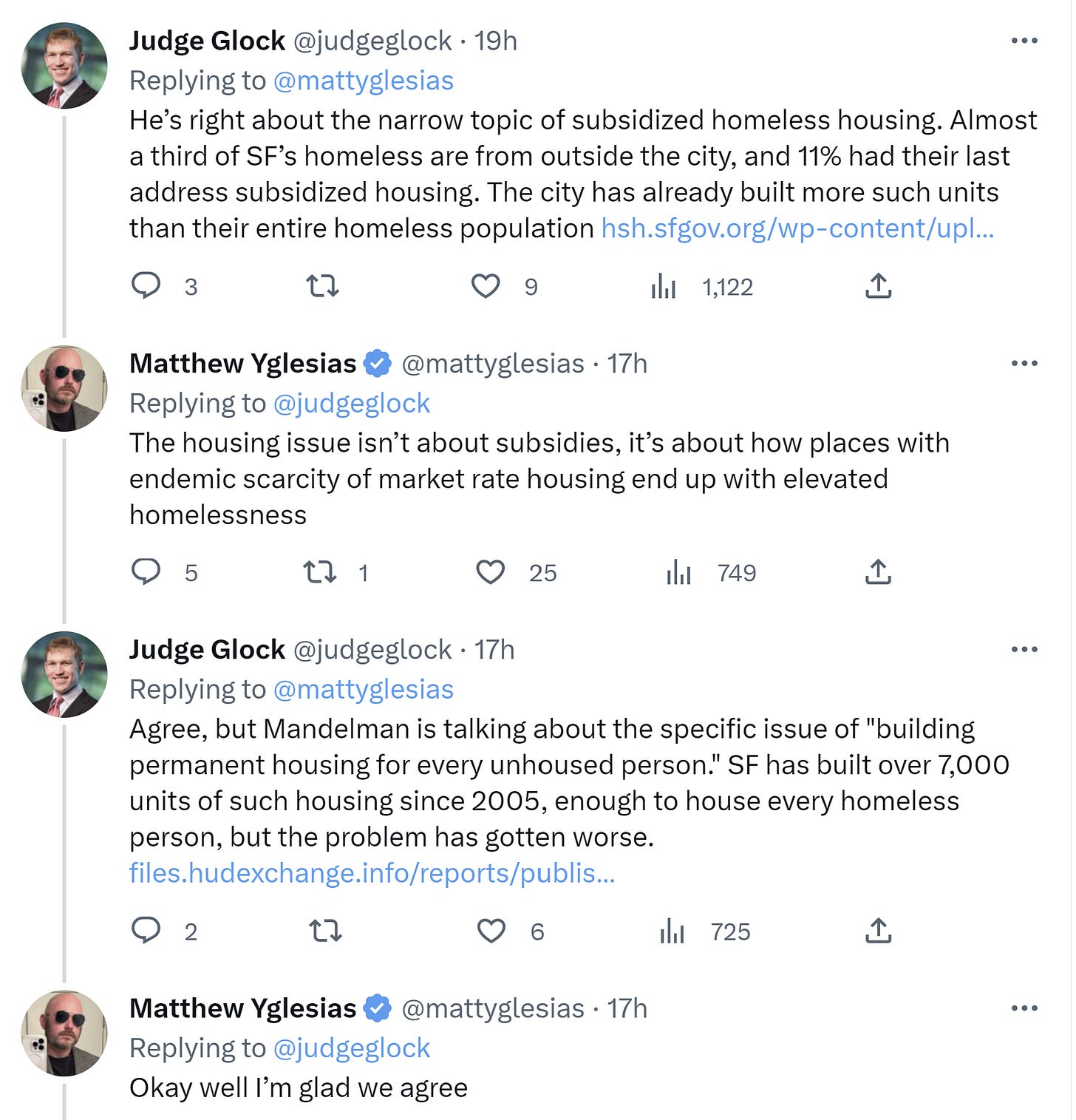 Totally non-responsive on the actual issue of basic substance here. It’s in fact very fair to ask why San Francisco’s efforts to build more units haven’t resulted in more obvious improvement in the homelessness problem. There’s no intrinsic reason why this question should be hostile to YIMBY interests at all. But it is hostile to YIMBY social culture, which insists that there is no valid answer to any housing question but “SUPPLY.” Yglesias is not rejecting a perfectly reasonable inquiry about housing because that inquiry is somehow antagonistic to the goal of building more but because YIMBY social culture is insular and derisive. To admit that it’s not true that every housing issue is totally reducible to pure supply and demand doesn’t threaten the movement for housing abundance. But it does threaten the sneering maximalism that’s so often employed by YIMBYs when discussing these issues.