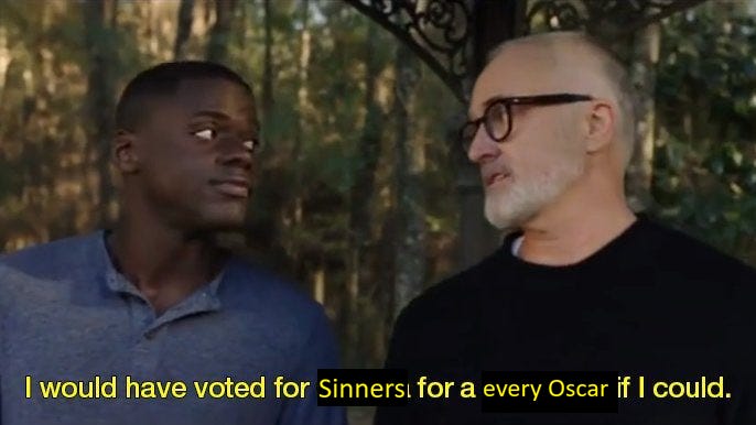 The preceding paragraph is the sort of thing that people get really mad about, but I have no idea why. Of course, when you spend months pre-lamenting the inevitable awards-season disrespect of a movie like Sinners, the respect that it ultimately receives will be colored by an assumption of illegitimacy among many. Whether that’s fair or not is not a meaningful question; of course that’s what happens. You already know it’s what happens. Don’t yell at me about it.