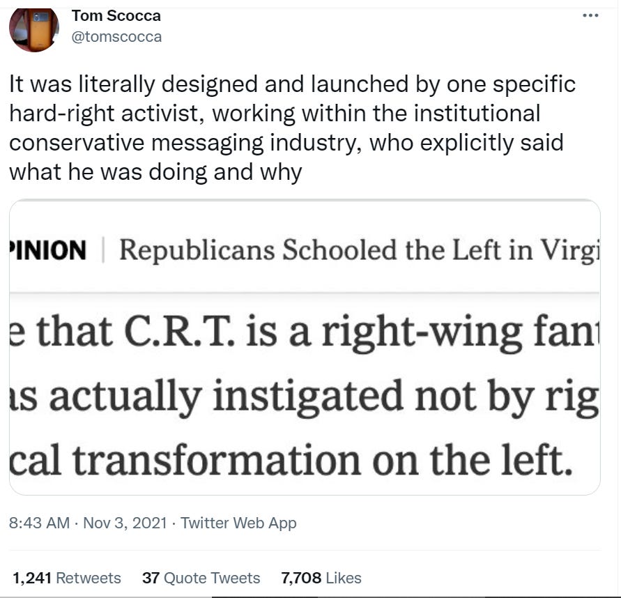 Like I said yesterday, liberals have been hopping from one foot to the other on CRT for months - it’s an advanced academic subject that could never leave the ivory tower, but it’s also just the idea that slavery and racism are bad, as needed. Tom Scocca is going for the “it’s just a ginned-up controversy that no liberals have been pushing for.” Scocca obviously knows that thousands of liberals have in fact gone to war for CRT in that span, arguing that CRT is good actually and every student should be taught it. But that’s not rhetorically convenient, so let’s pretend nobody, not a single Democrat, has been playing into the frame. That will be constructive.