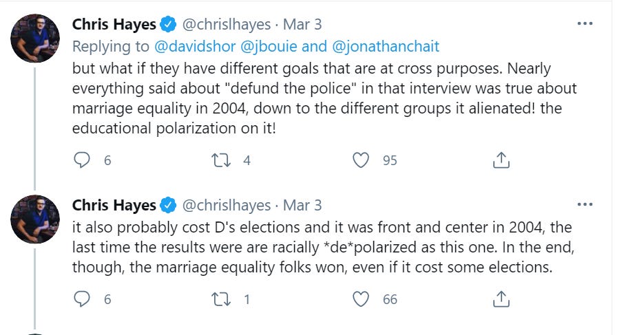 I don’t mean to drop you into a conversation without context (here’s the thread) but what’s being dramatized here is essential and pretty easy to understand. As I linked to on Monday, David Shor’s argument about the 2020 election includes the idea that issues highly popular with progressive media, activists, and influential donors were in fact highly unpopular with much of the country, including with voters of color who are broadly assumed to vote for Democrats consistently. One such issue was “Defund the Police.” Here Chris Hayes analogizes this effort to the fight for gay marriage. This is a rhetorically convenient comparison for defenders of defunding the police - or the entire BlackLivesMatter wing of contemporary Democratic politics - because gay marriage is obviously morally correct and won in a decisive victory.