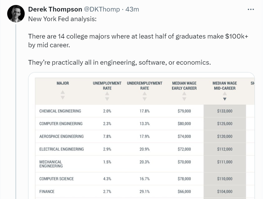 Again, of course the average programmer is fine. But to be the average programmer you have to a) become a professional programmer and b) be good enough to be average! I have a friend who’s an independent contractor who does back-end web development for a lot of financial and insurance firms. Last year I asked him how he felt the average newly-minted computer science BA was doing in the labor market, in 2023. He shrugged and said, “I don’t know, can they code?” And that’s the whole game, isn’t it? The question isn’t so much what your major is, the question is, are you good at what you do? The major and degree help to give you the necessary skills that you need professionally, yes, but you can only access those skills if you have a certain baseline of underlying ability. And your diploma is mostly valuable to you to the extent that it acts as a signal to employers that you’ve got that baseline of ability. Meanwhile, employers believe that the signal is far stronger if the degree says Stanford or CalTech or UC Berkeley on it, and we’re pumping out tons of mediocre young coders from nondescript state school (like the one where I got my BA) who are really struggling, even though they did exactly what we told them they should do. Unfortunately “go to MIT and then get a job at Google” is not a replicable career path for most. All of the charts and graphs showing average incomes make it appear like there’s a clear path to follow, but like everything else in our economy, this is all a competitive arena where people fight over scarce goods, and winner take all.