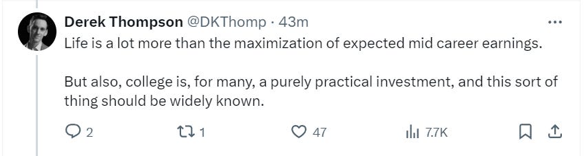 If you’ve been reading me for any length of time at all, you already now how I feel about these tweets from Derek Thompson of The Atlantic. This outcome information is only useful to students if they can be confident that they actually can a) get into those fields and b) avoid the lowest rungs of their labor conditions. And we can’t say that based on outcomes because of selection effects - the students with the essential cognitive skills (however defined) self-select into the majors that result in these good careers and the kids who lack those essential cognitive skills are screened out of those majors, and thus we’ve got a big glaring confound here.