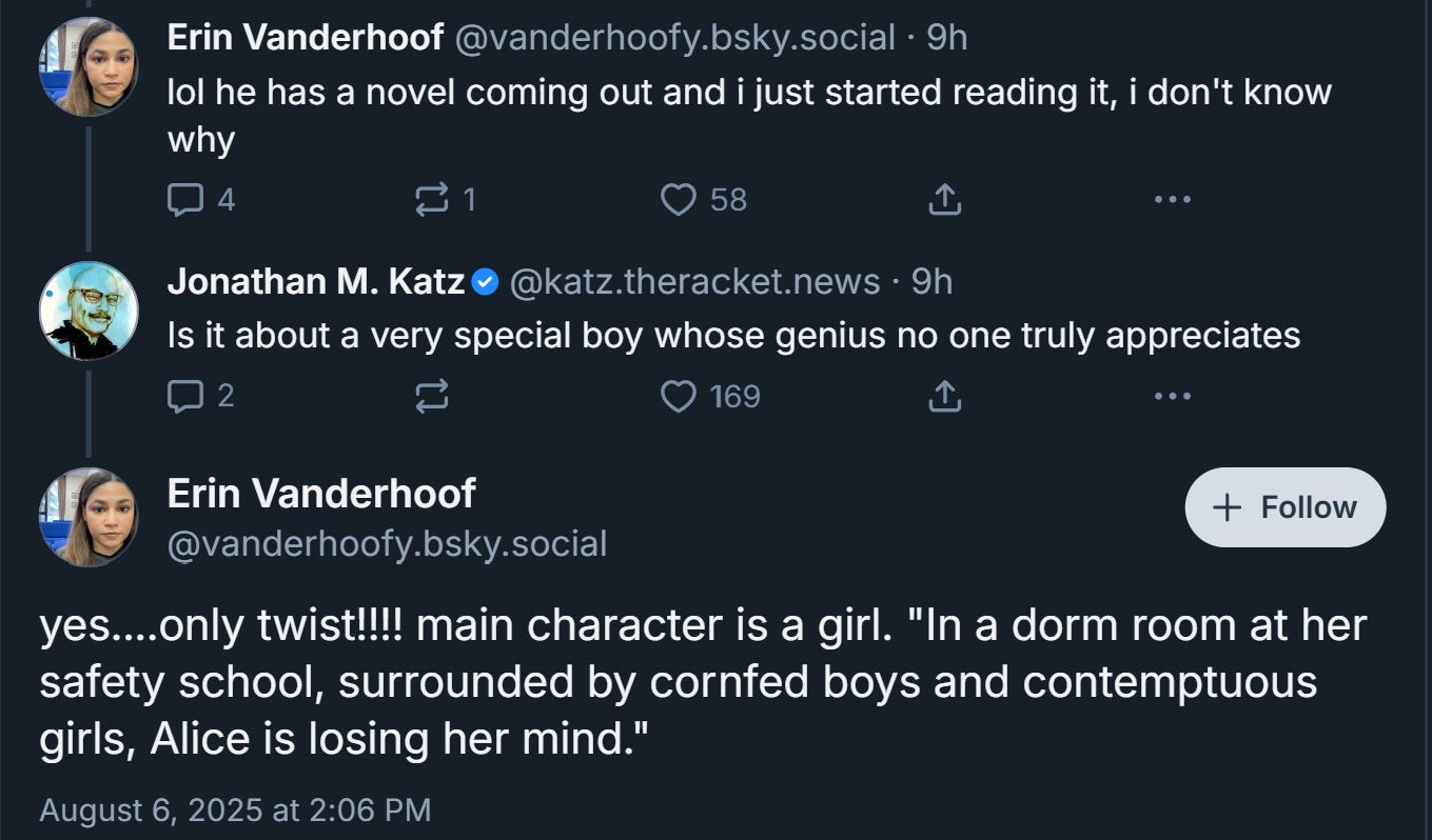 What I can tell you for sure is that, if Katz has written any novels, I won’t be commenting on them because I haven’t read them, and if I were to read them, I would share my honest opinion about how good or bad they are regardless of his supreme lack of affection for me. I've done that before, many times, praise people who see me as their enemy, defend people who dislike me personally, stick up for people who have told lies about me. It would be an insult to my own dignity to not be honest when it came to people who haven’t treated me very well. For example, Nathan Robinson is someone who has tried to unperson me in the industry, including by spreading the transphobia lie, and yet I’ve public praised his socialism primer multiple times in multiple venues. Because I really believe in this shit, you know? I believe in books and ideas and argument and all that stuff.
