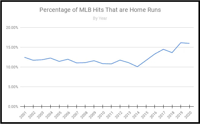 That may look like modest growth, but since there are 40,000+ hits in a baseball season that 6ish% increase since 2013 is a big deal. Expressed as a percentage of runs the trend is stark.