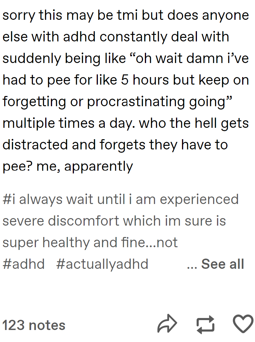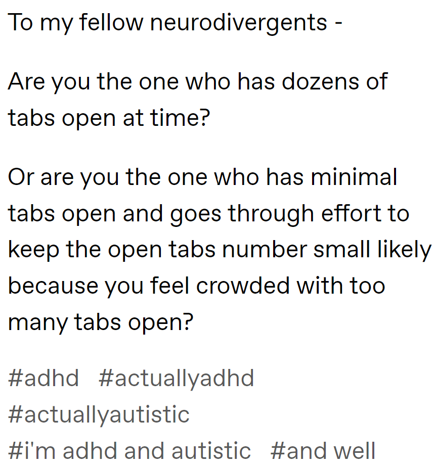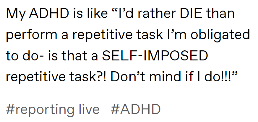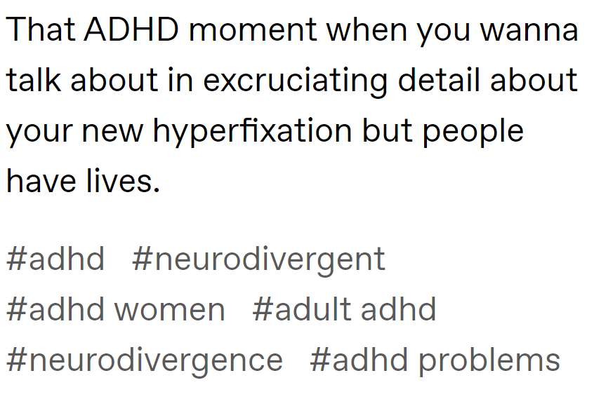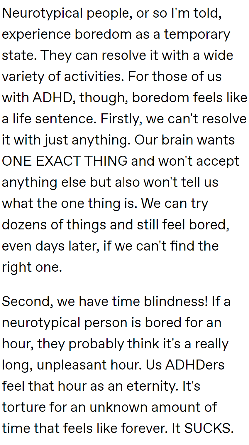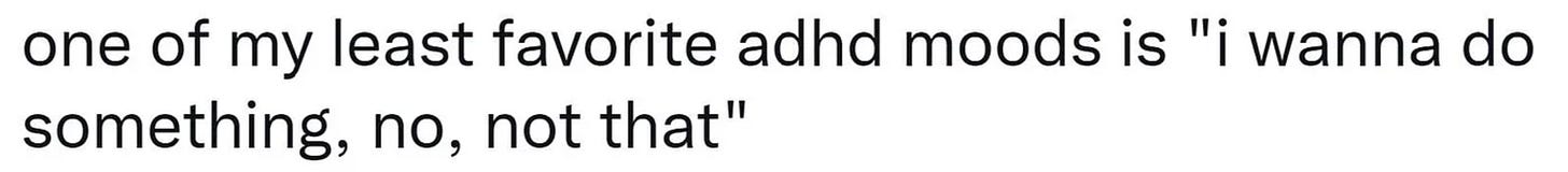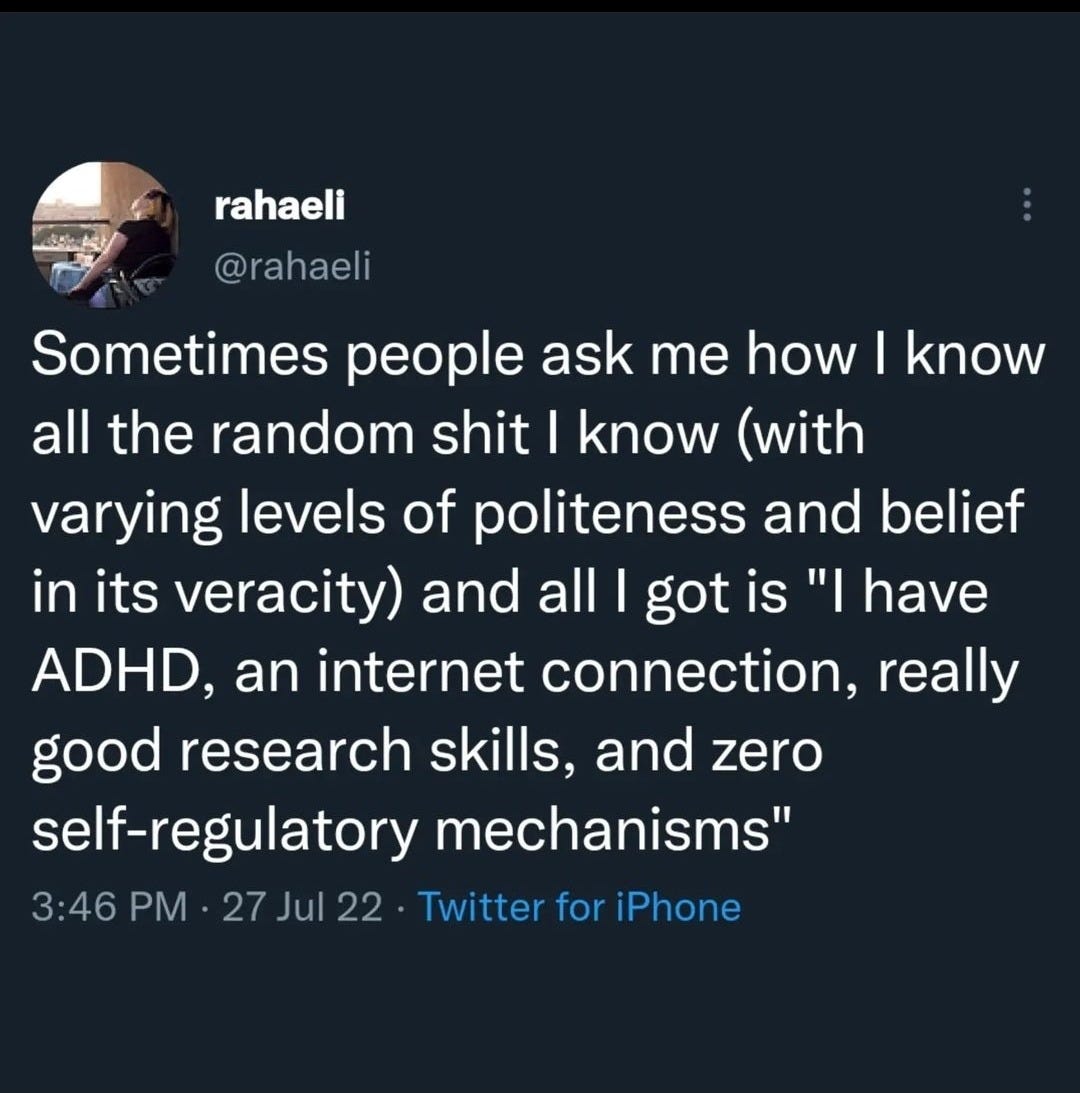 As James Greig laid out earlier this year, all of this is… annoying. Worse, though people keep telling me that this sort of thing is just kids being dumb and they’ll grow out of it, minimal investigation reveals that there’s plenty of people in their 40s and above who have gotten on this train. But beyond annoyance, I think it’s another example of behaviors that are sold as self-protective that will ultimately cause harm. I don’t write this stuff to hold people up for mockery but to argue that these are fundamentally self-destructive mental habits. Some have compared adult ADHD discourse to astrology, and the comparison is apt: both ascribe all of a person’s self to totalizing systems that (they imagine) bring order and meaning to their lives; both are exercises in unreality that can never actually create meaning in the way that people crave. I have always found this instinct to ascribe the whole self to a single factor to be bizarre, personally. Who wants to decompose the self down to one overarching attribute that’s shared by many millions of people? I guess some people just feel such little sense of self from simply inhabiting their natural personalities that they look everywhere for external definition. In the long run, it will provide no comfort.