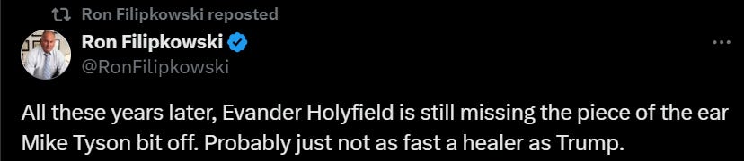 This event produced two bodies; both of those killed were, incontrovertibly, real people who had real verified lives that are easily confirmed by the documentary record, by their online presence, and by the testimonials of those who knew them. There is video of both, alive, at the event. So these actual living people became ex-people during the event. Were they in on it? If so, that means they signed up for a literal suicide mission. Why? Why would Corey Comperatore, an all around mundane person who worked at a plastics company and served as a volunteer firefighter, sacrifice his life in that way? Or perhaps he was just collateral damage - they needed to fire into the crowd to make the fake attack credible. Again, firing a live round past the very politician you’re trying to support seems like a bad idea. Beyond that, you’d have to have at least several dozen people involved in this conspiracy willing to say, “yeah, I’m onboard with being an accessory to murder of one of our candidate’s supporters if and when we hit one after firing an assault rifle into a crowd of people.”